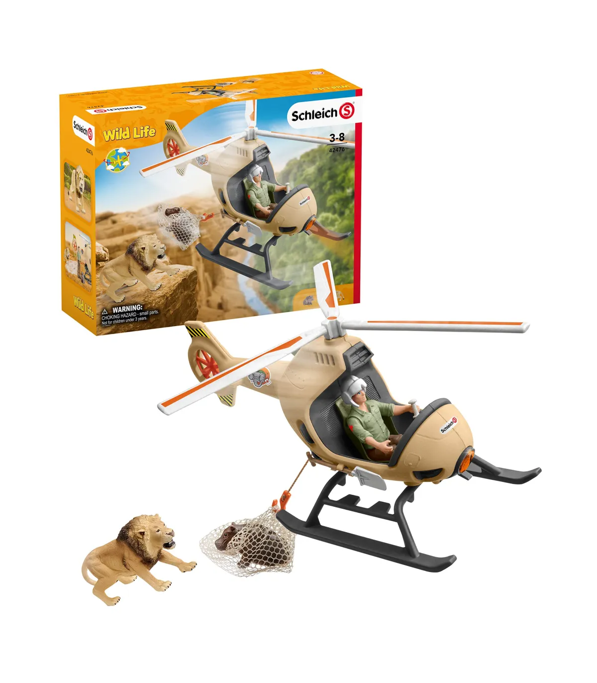 1 león, 1 cría de hipopótamo, 1 ranger, 1 helicóptero, 1 casco, 1 cabrestante, 1 red, 1 pala