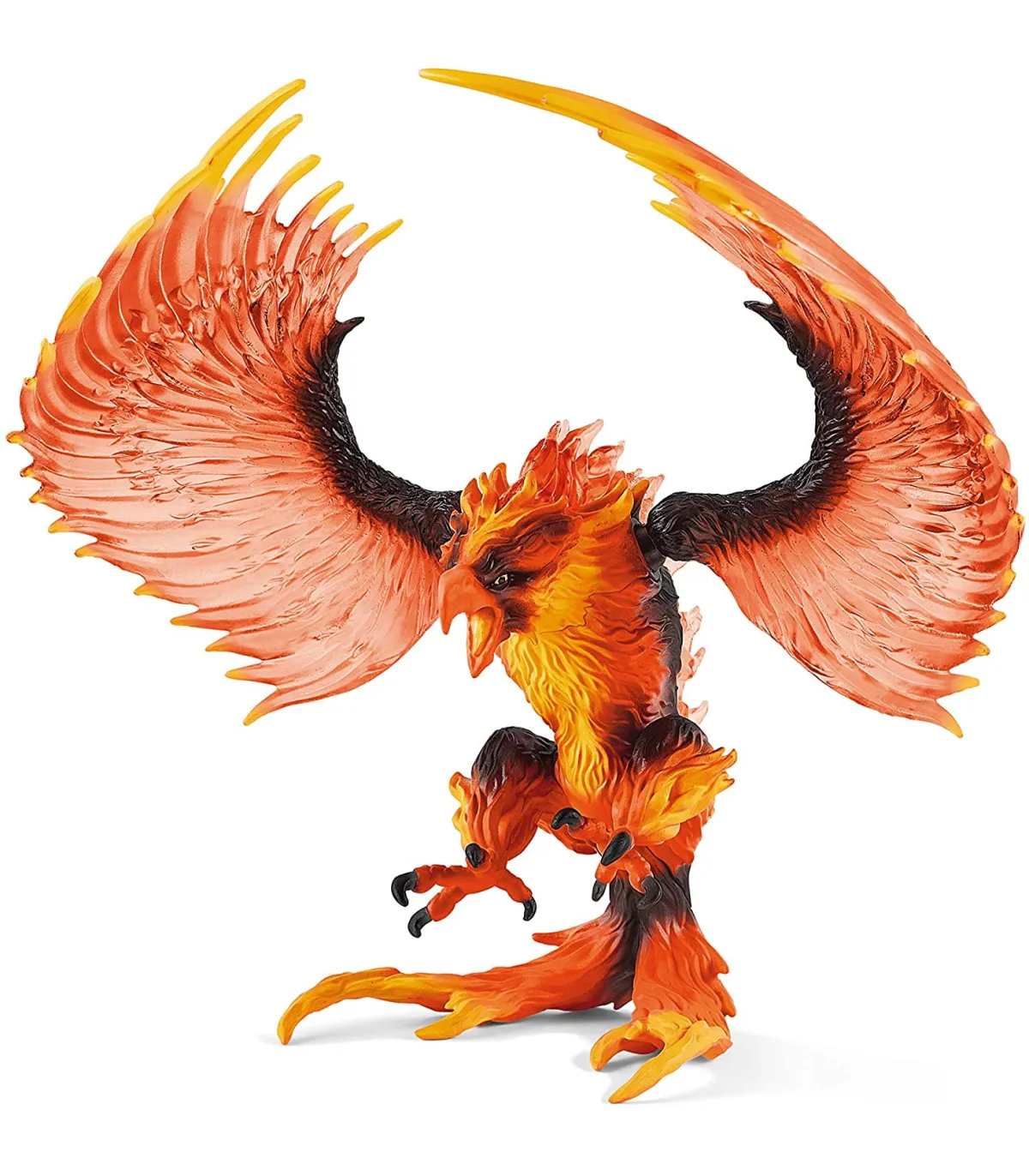 A sus observadores ojos no se les escapa nada. Por encima de los volcanes, el águila de fuego schleich® ELDRADOR® CREATURES vuela en círculos con majestuosidad. Sus ágiles alas permiten a la habilidosa ave adquirir gran fuerza y realizar sin problemas complicadas maniobras de vuelo. Puede incluso percibir en el suelo los movimientos más sutiles y si se trata de un intruso, no se lo piensa dos veces: despliega sus ágiles alas transparentes y se precipita hacia el enemigo dejando una cola de llamas tras de sí que la hace parecer un cometa en el aire. Para los intrusos, ser apresados por el águila no es solo un encuentro enojoso, es puro terror, pues posee unas garras extremadamente afiladas que se aferran sin compasión. Su pico curvado y afilado es otra arma de la que hace uso en sus ataques. Y para culminar, el águila de fuego produce con sus alas una formidable tormenta de fuego que barre a sus enemigos del mapa sin más.