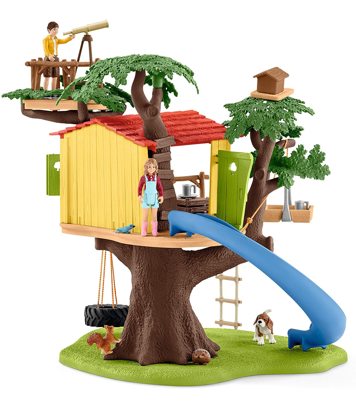 Los dos niños de la familia de grajeros, Ben y Sarah, pueden pasarlo bien, jugar y picar algo de comer durante horas en la casita del árbol de schleich®. ¿Quién no ha soñado alguna vez en tener su propia casita en un árbol? El set contiene un montón de accesorios y proporciona horas de diversión. Mientras Ben observa a los animales desde la plataforma de observación, Sarah se desliza por el tobogán. El cachorro ya la está esperando. Sarah puede volver a subir a la casita del árbol por la escalera. El precioso Beagle puede tambíen subir a la acogedora casita con la polea, así todos pueden jugar. El erizo también tiene su propia casita en el agujero del tronco y al pajarito le encanta tener su espacio en las hojas. El set contine 2 figuras humanas, 4 animales y maravillosos accesorios. Este set es el complemento ideal de la gran granja 42407, que está disponible por separardo. Las figuras de schleich® contienen muchos detalles, están pintadas con un gran cuidado y permiten a los niños jugar y aprender a la vez.