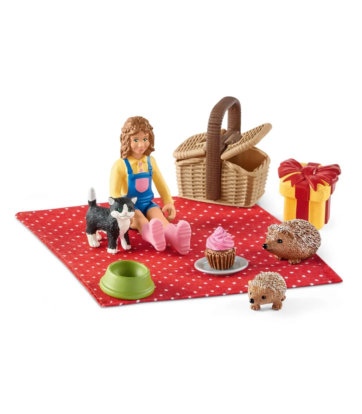 Hoy es el cumpleaños de Sarah y ha organizado un picnic. Ya ha recibido un regalo enorme y con muchos colores. El gatito, el erizo y el bebé erizo ya están allí mientras espera a que lleguen los invitados. ¿Conseguirán saborear el delicioso cupcake?