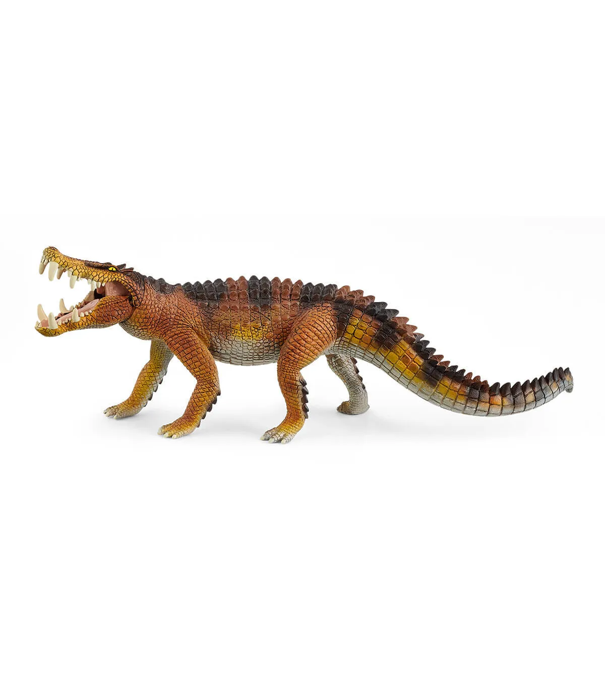 El Kaprosuchus de schleich® DINOSAURS se llama así por sus dientes y la forma de su cuerpo: su nombre significa «cocodrilo jabalí». Vivió en el Cretácico tardío y probablemente habitaba sobre todo en tierra, donde cazaba pequeñas presas. Hasta ahora, se ha encontrado un solo cráneo de Kaprosuchus en el Sahara, por lo que solo podemos suponer cómo era su apariencia. Es probable que midiese 6 m de largo.