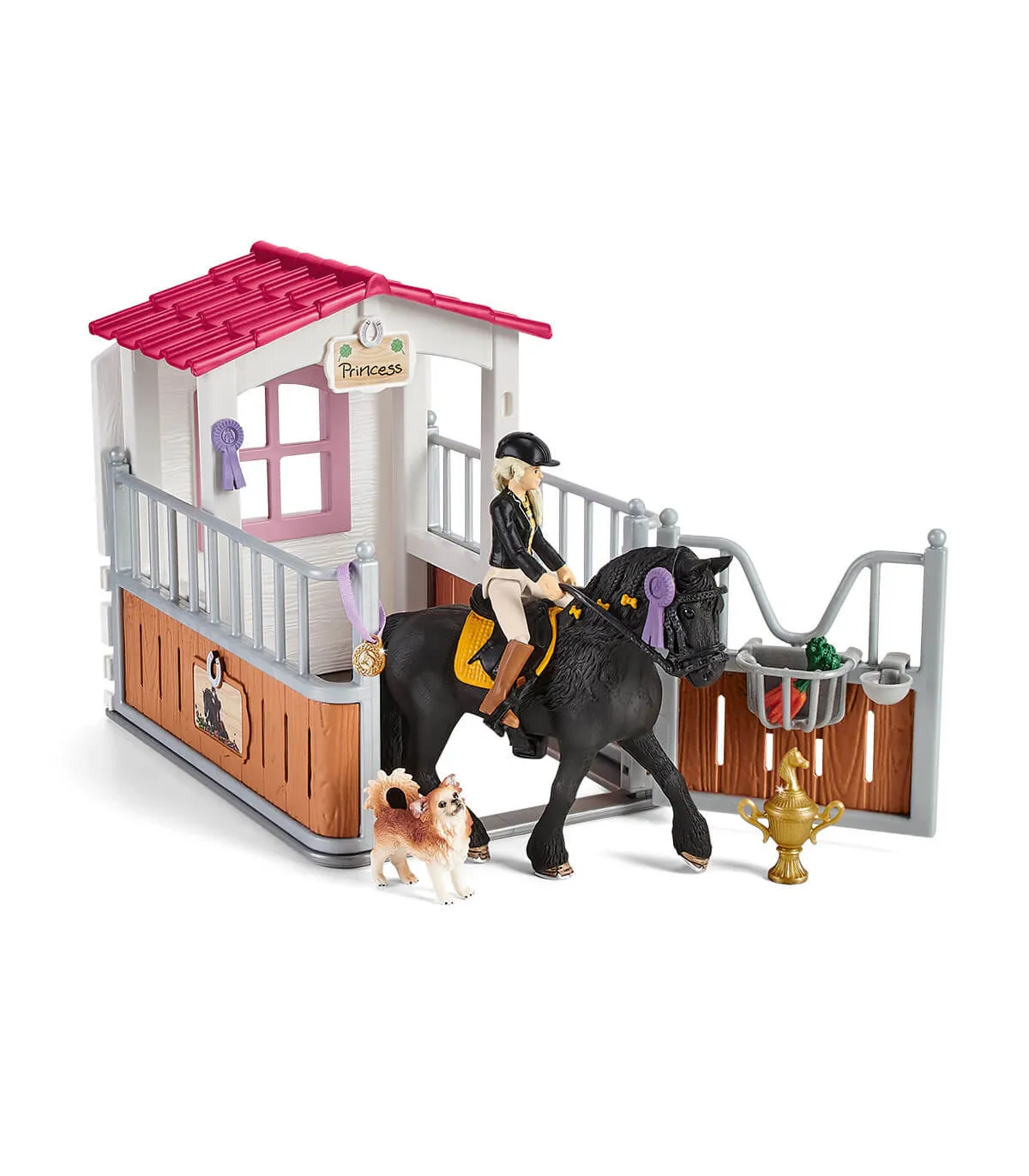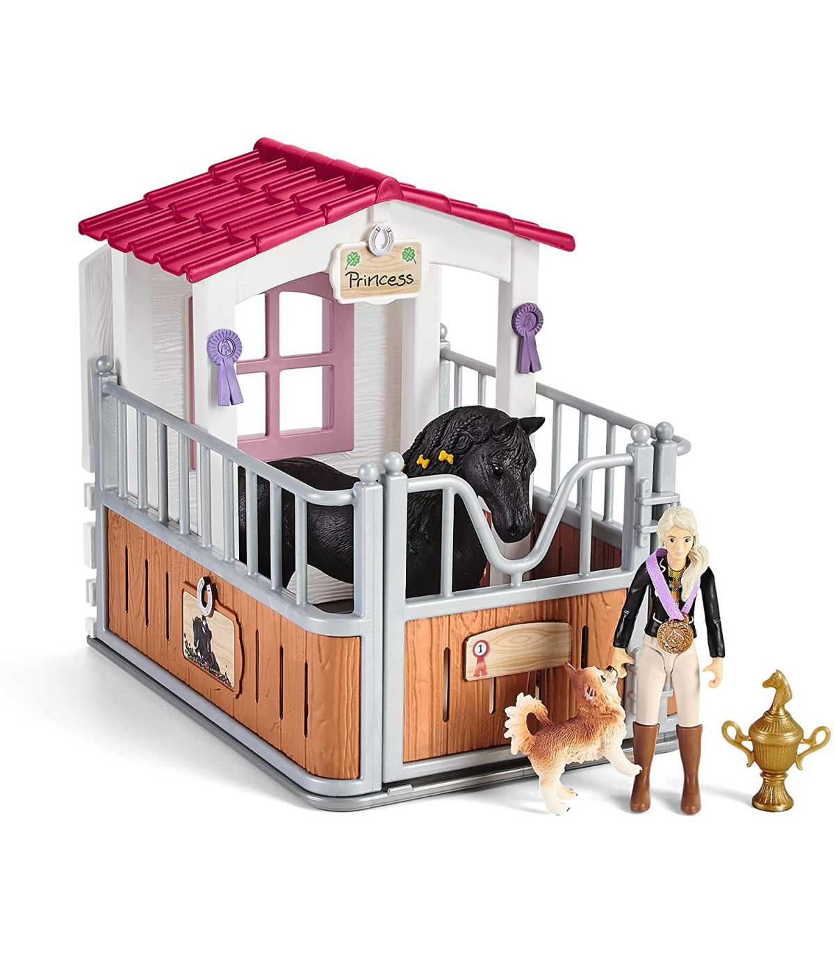1 box, 1 chica, 1 yegua frisona, 1 chihuahua, 1 silla de montar, 1 brida y riendas, 1 pesebre, 1 abrevadero, 1 zanahoria, 1 copa, 1 medalla de oro, 2 lazos de premio, 1 casco, 1 pliego de adhesivos, 1 manual de instrucciones de montaje