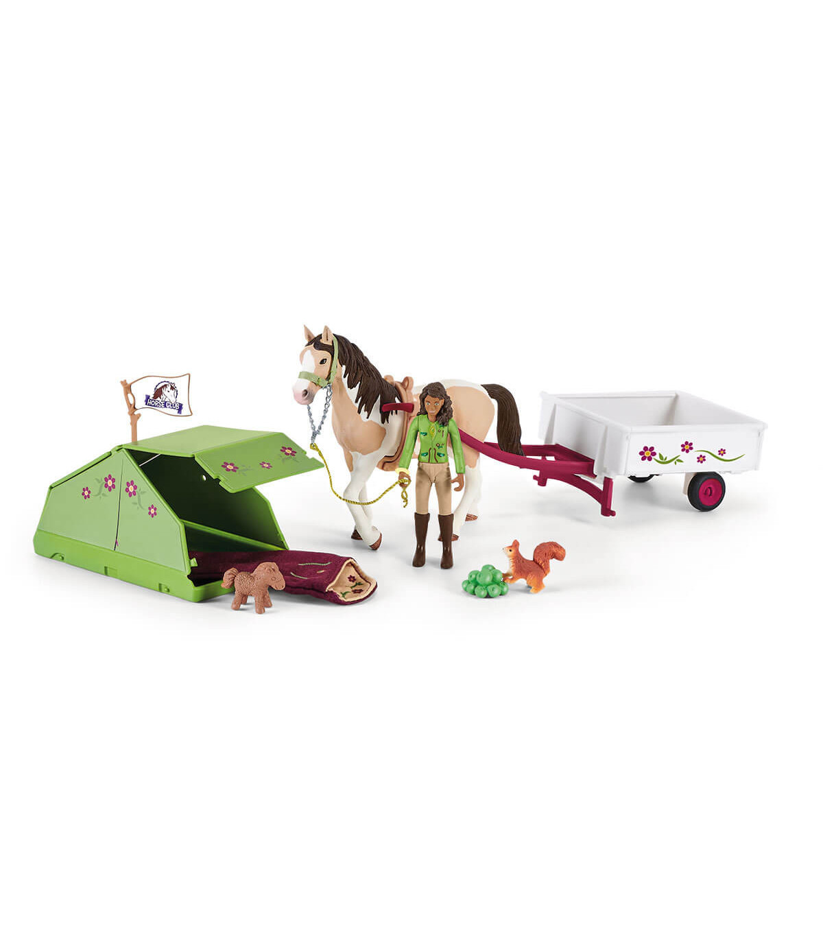 1 remolque, 1 tienda de campaña, 1 caballo de peluche, 1 bandera HC, 1 saco de dormir, 1 correa, 1 yegua pinta, 1 figura Sarah, 1 ardilla, 1 casco, 1 manzana verde, 1 cabestro