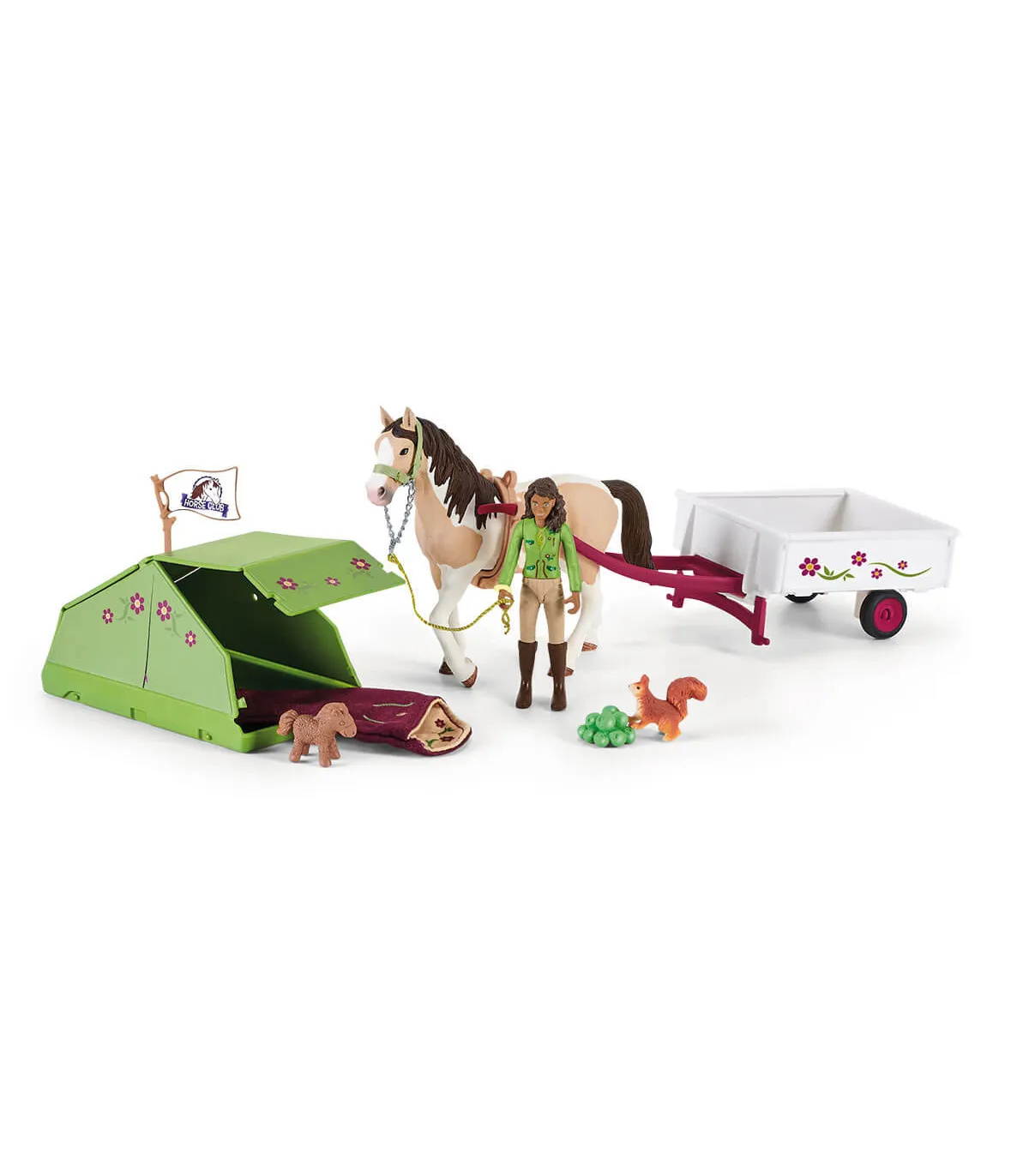 Sarah, la figura totalmente móvil, está deseando ir de excursión al camping de schleich® HORSE CLUB. Con ayuda de la correa, ata a su yegua pinta al remolque, donde carga además la tienda de campaña y los víveres. Después, se coloca el casco y coge el cabestro. ¡Vámonos! Al llegar, Sarah ofrece al animal con bellas manchas una rica manzana verde como recompensa por haber tirado del remolque. A continuación, comienza a montar la tienda de campaña, saca el saco de dormir y coloca dentro el bonito caballo de peluche. Por último, Sarah iza la bandera secreta del HORSE CLUB bajo la atenta mirada de una ardilla.