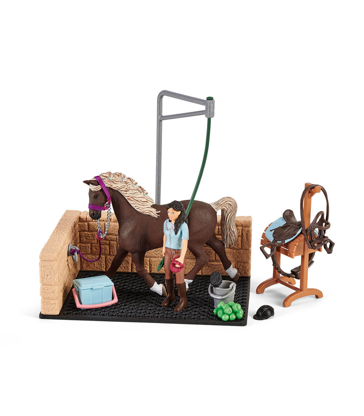 El lavadero de caballos con Emily y Luna de schleich® HORSE CLUB es muy moderno. Emily coloca la montura y la brida sobre el caballete, ata a su bella yegua Holsteiner con el cabestro al lavadero de caballos y le limpia el pelaje con la ayuda de la rasqueta y el cepillo, tras sacarlos de su caja de limpieza. La manguera se encuentra colgada en un brazo giratorio, lo que hace posible llegar con facilidad a todas las partes del caballo. La alfombrilla de plástico evita que puedan resbalarse durante la refrescante ducha.
