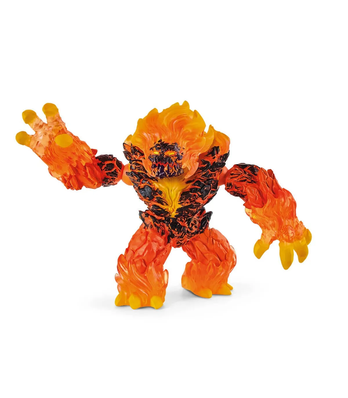 El demonio de lava de Schleich® Eldrador® Creatures irradia tanto calor que (casi) nadie se atreve a acercarse a él. Y es que todos aquellos que lo atacan saben que: todo aquello que el ardiente coloso agarra arde en llamas. Su enorme cuerpo está hecho de piedra de lava fundida y en su cabeza se alborota una melena llameante. A pesar de su apariencia maciza, el demonio de lava es extremadamente móvil, y esto lo convierte en un adversario demoníaco: como puede girar su torso completamente, no se le escapa ni el más mínimo movimiento. Aquel que se le acerque será descubierto de inmediato. Con sus brazos móviles agarra a sus enemigos en un abrir y cerrar de ojos y los sacude con fuerza. Además, el demonio de lava puede mover su mandíbula: en el momento en que abre su boca, de la que brotan chispas, sale un aliento de fuego llameante —¡no solo huele a piedra quemada, sino que también es tan ardiente que resulta insoportable!
