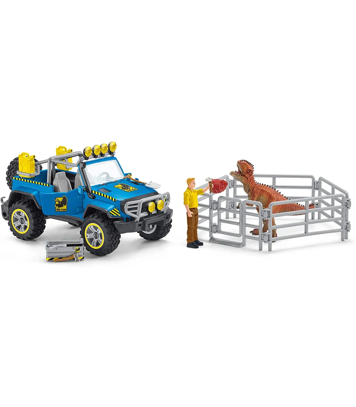 Con el todoterreno, LUIS podrá llegar rápidamente hasta el asentamiento y capturar allí al giganotosaurus utilizando un cebo de carne. Si durante el camino se queda atrapado en el lodazal, puede cambiar los neumáticos fácilmente con su caja de herramientas o volver a sacar el todoterreno con el cabrestante. El todoterreno con asentamiento de dinosaurios de schleich® DINOSAURS ofrece una gran cantidad de posibilidades. Descubre el universo schleich® DINOSAURS al completo y la emocionante aventura de los hermanos Colby en www.schleich-dinosaurs.com