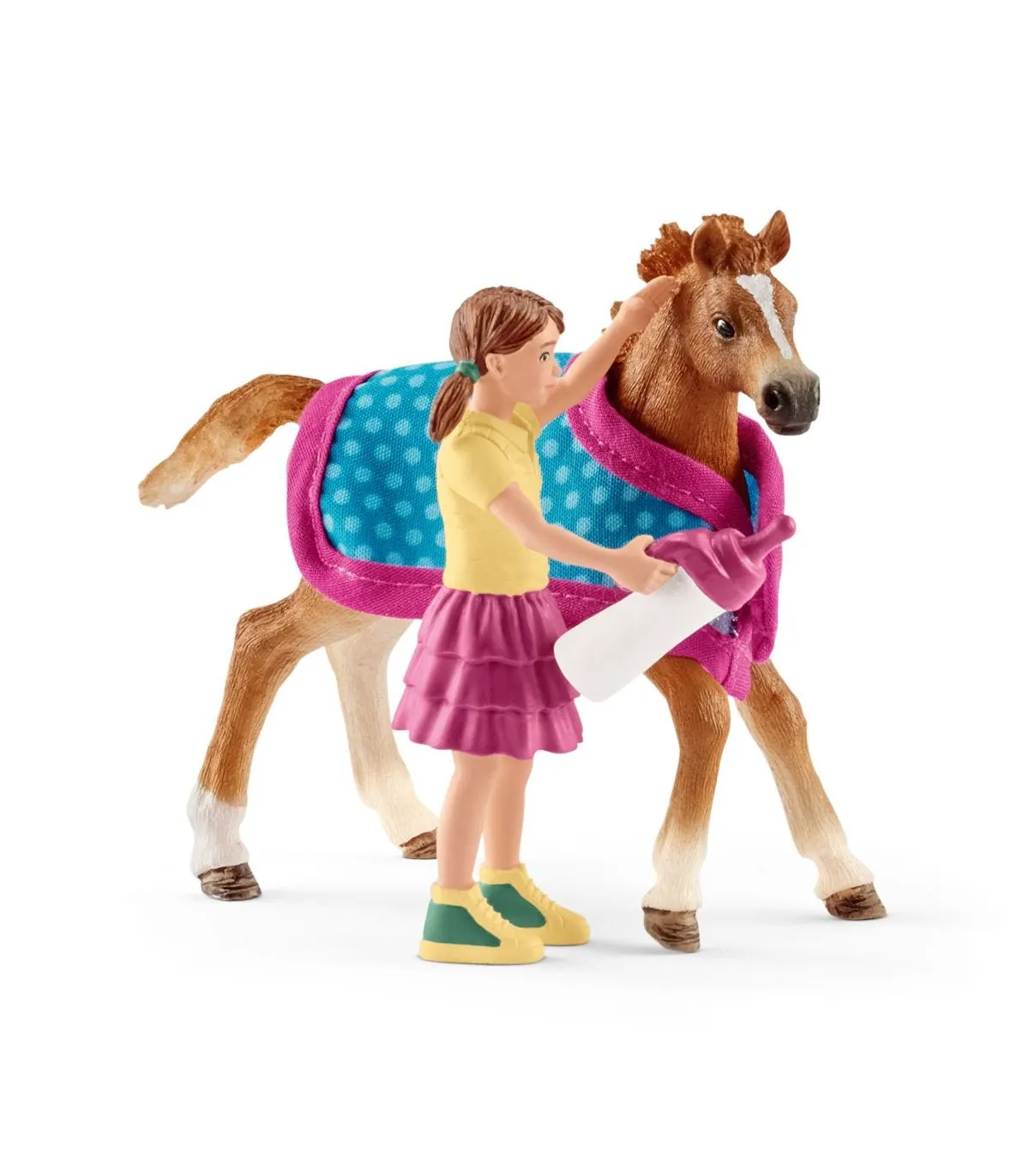 La pequeña niña está totalmente cautivada por el pequeño potro purasangre inglés que corretea por el pasto.