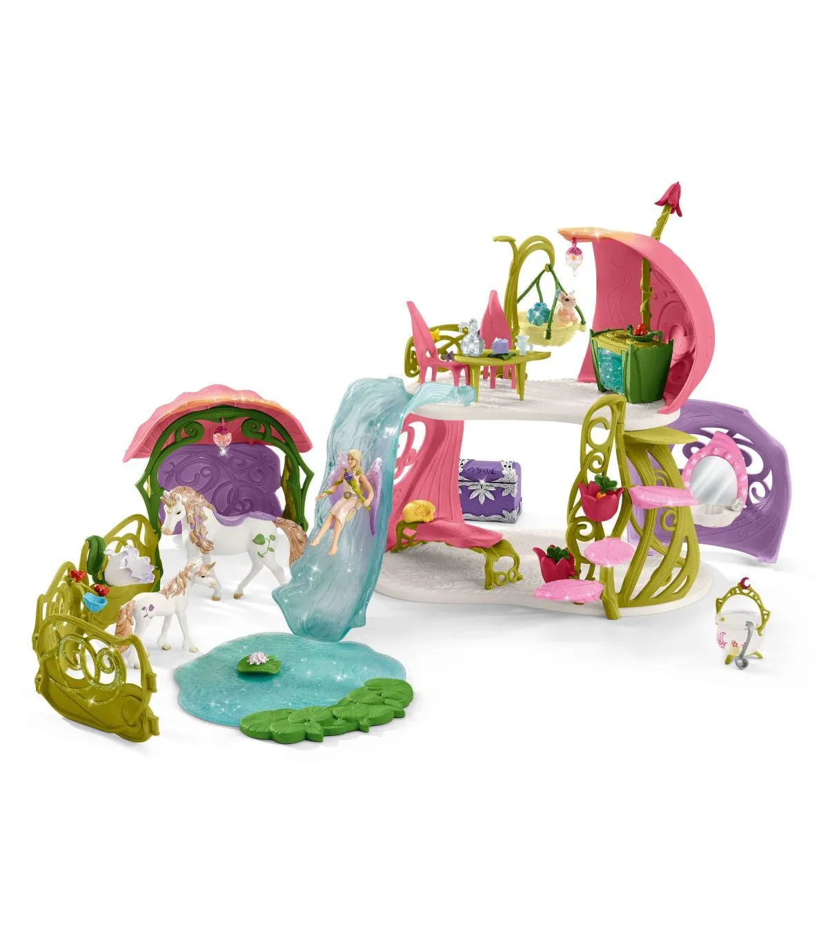 1 x casa, 1 x unicornio, 1 x potro de unicornio, 1 x ardilla, 1 x elfo, 1 x escalera, 1 x tobogán, 1 x cesta de transporte basculante, 6 x vallas, 1 x establo, 1 x artesa de forraje, 1 x lago, 1 x baúl, 1 x nenúfar, 1 x mesa, 2 x sillas, 2 x platos, 1 x