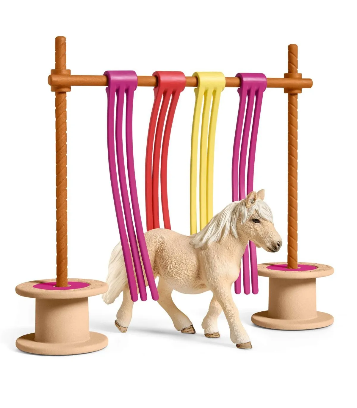 1x poni Shetland, 2x plataformas, 2x postes, 1x larguero, 4x cortinas de tiras, 1x hoja de pegatinas