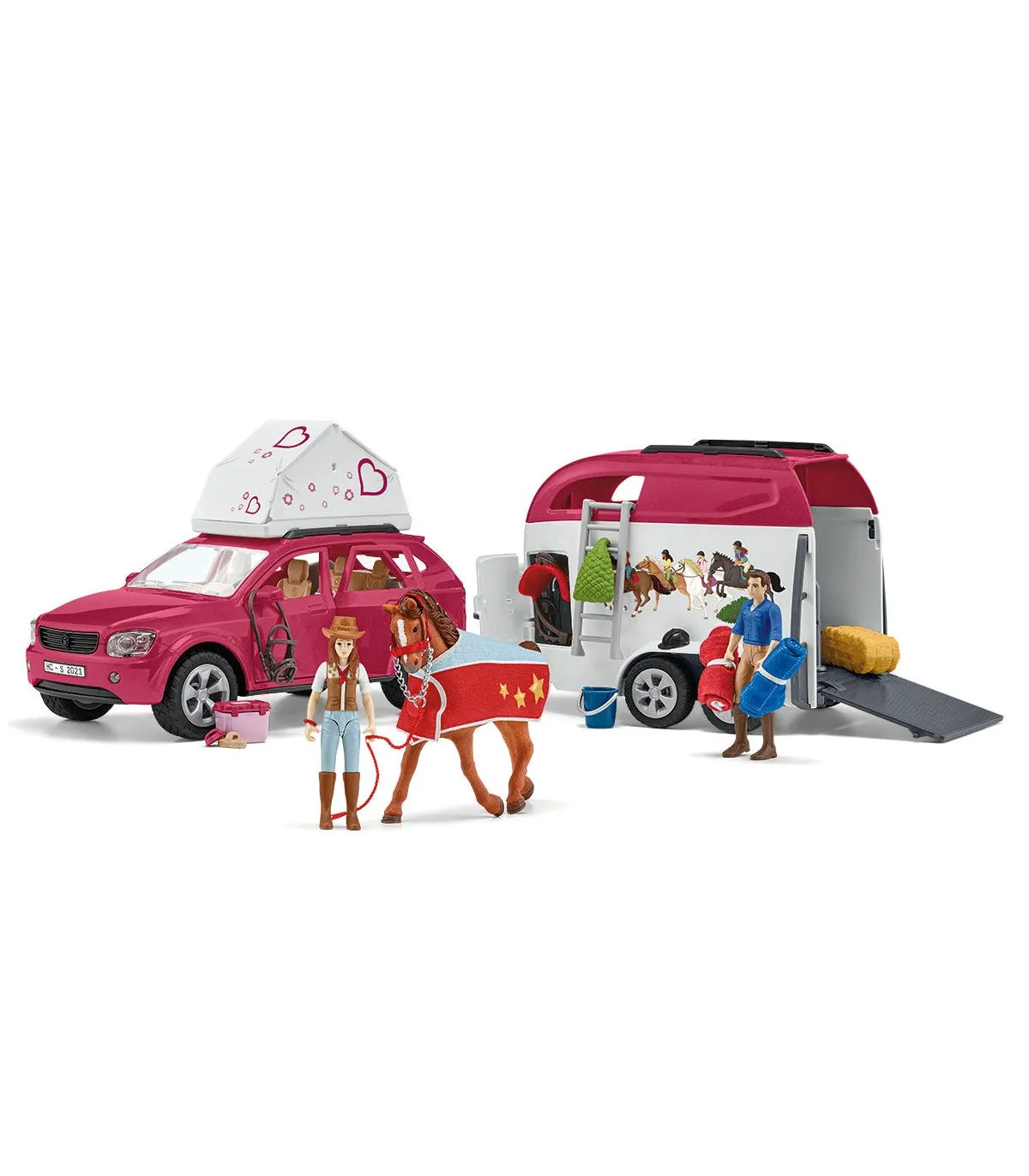 ¡Hannah y su padre vivirán una maravillosa aventura con coche y remolque para caballos del HORSE CLUB de schleich®! Las numerosas funciones ofrecen muchas posibilidades de juego. Los asientos del vehículo utilitario deportivo pueden plegarse, lo que permite que la figura masculina del Sr. Kramer pueda guardar muchas cosas dentro del vehículo como, por ejemplo, la tienda abatible y los numerosos complementos de la monta, como el casco, la silla, la brida, el cubo, el maletín con productos de limpieza, el cepillo para dar masajes y la almohaza. Además, dispone de una escalera acoplable. Hannah no solamente ha entrenado diligentemente para la competición, sino que también ha practicado cómo subir a su yegua Holsteiner al remolque desacoplable. Gracias a su conducta segura y tranquila, la yegua se puede subir y bajar del remolque con total confianza tirando de su ronzal. Para que no le falte de nada a la yegua durante el viaje, se cuelga una red con heno y se depositan fardos de paja en el remolque.