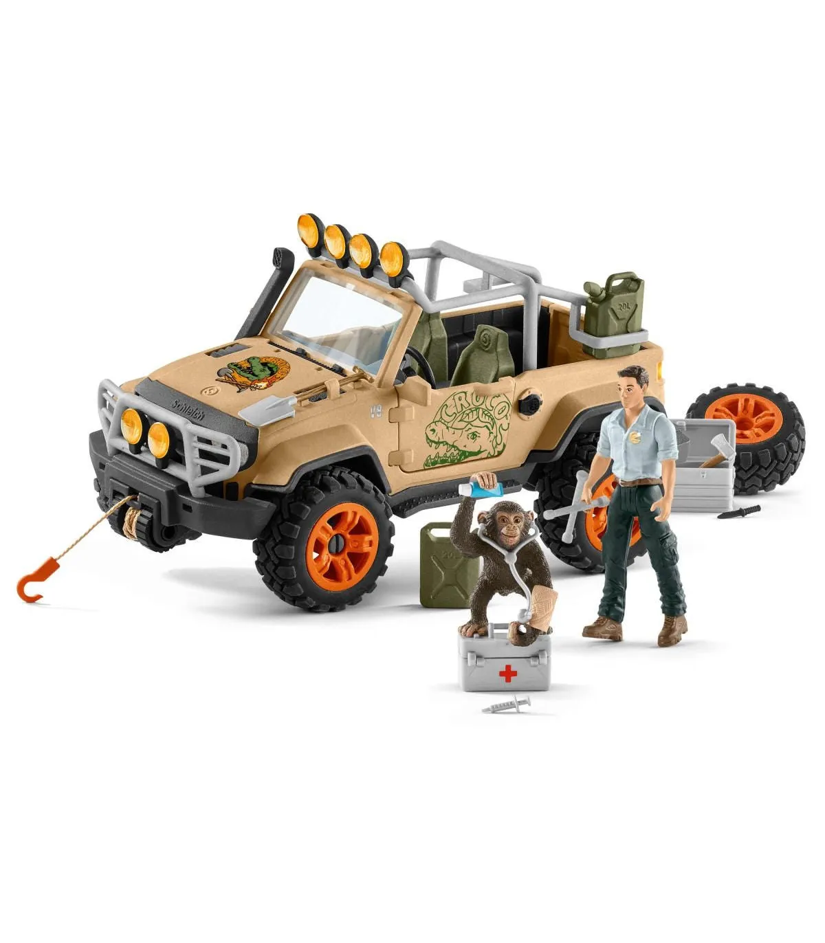 Es la hora de disfrutar de una aventura llena de acción con el guardabosque David y su fiel compañero , ¡el pequeño chimpancé! El cabestrante extensible puede engancharse en la parte delantera y trasera del vehículo y asegurarse así de mucha diversión.