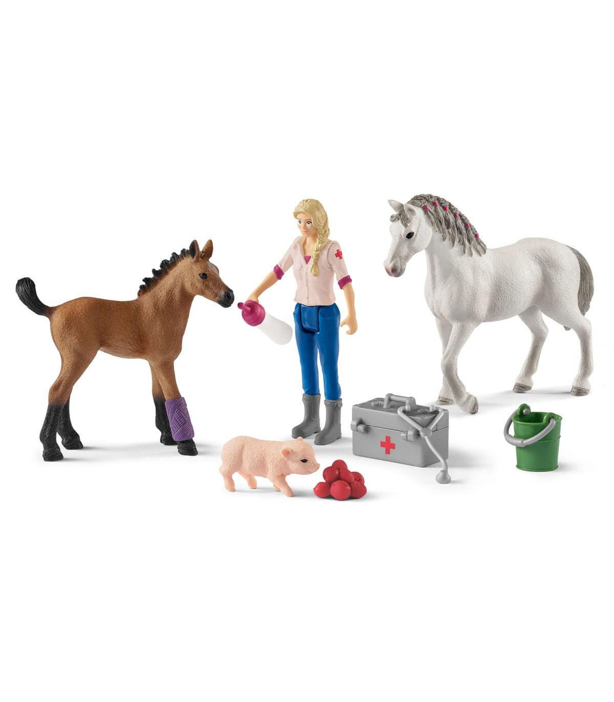 Fantástico juego de complementos para el nuevo establo para caballos con 3 preciosos animales (yegua, potro, lechón), veterinaria y muchos accesorios más. Mientras la veterinaria se ocupa del potro y le cambia el vendaje, la yegua vigila que no le pase n