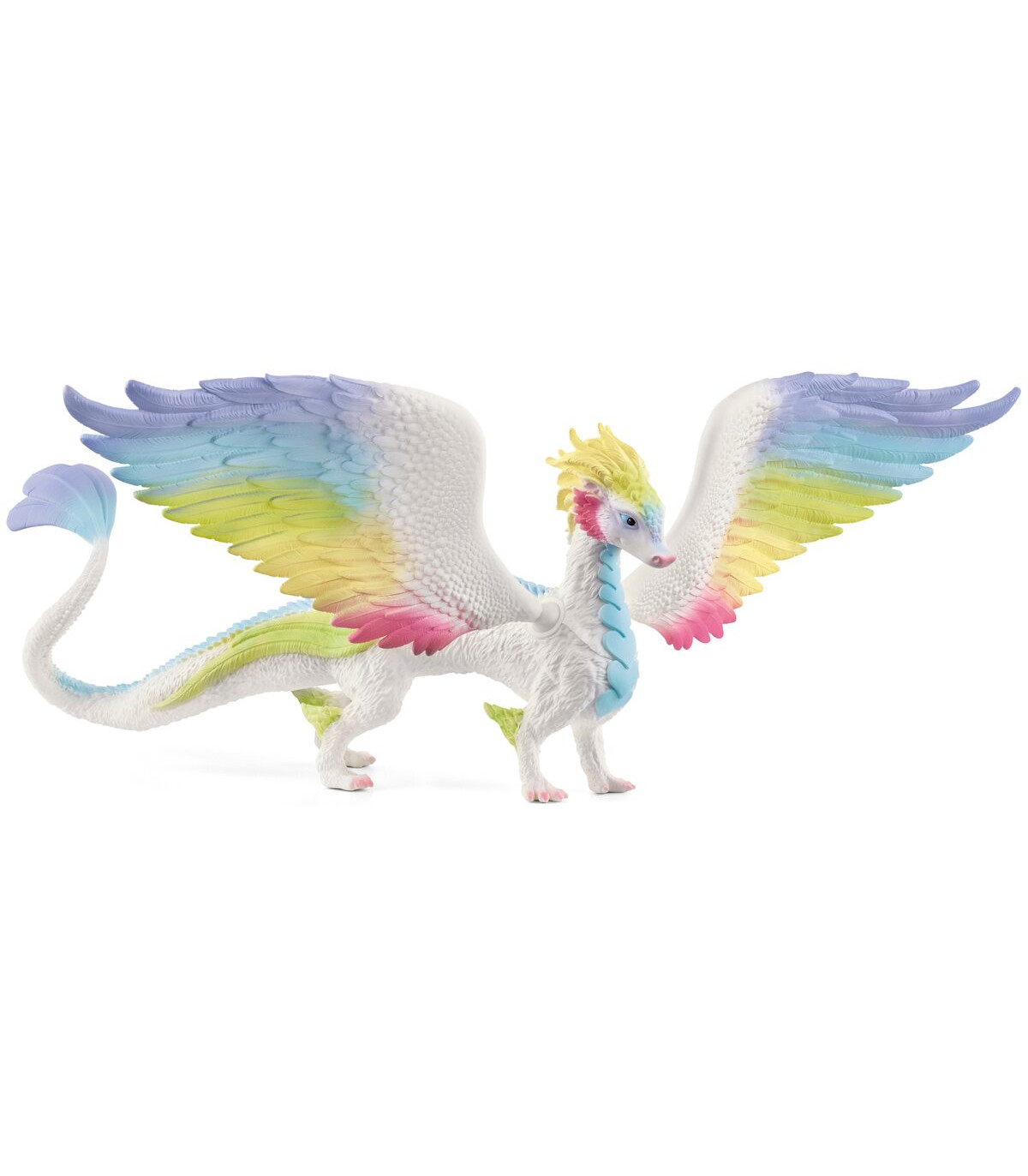 ¡Ahí está! Se dice en el universo BAYALA® que es más raro verlo que una estrella fugaz o un trébol con exactamente cuatro hojas. Si te encuentras al Dragón arcoíris del universo BAYALA® de schleich® en el techo de tu habitación, estará buscándote o se le habrán agotado las provisiones de su despensa. O ambas cosas. Su colorido plumaje refleja todos los rayos del sol con cada aleteo. La mayoría de las veces, también se le puede oír, ya sea por su estruendoso bramido o porque su cola ha vuelto a barrer algo de la estantería ¿Lo recogerá...?