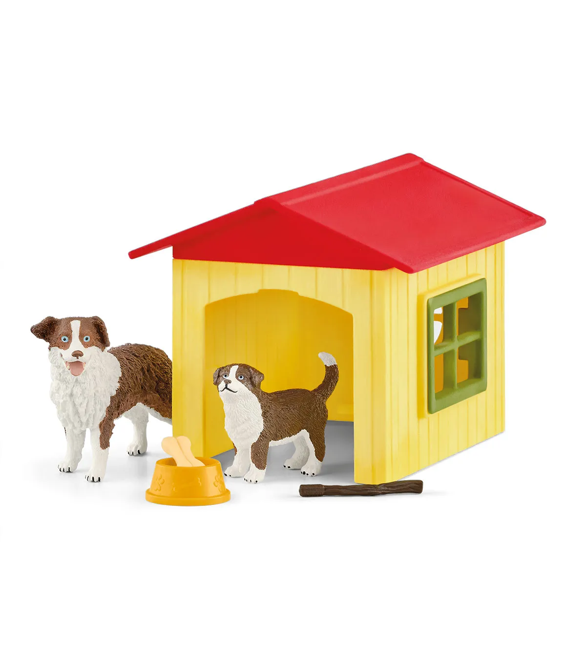 1 Caseta de perro con trampilla lateral y dos ventanas, 1 perra de pastor australiano, 1 cachorro de pastor australiano, 1 cuenco, 1 hueso, 1 palo