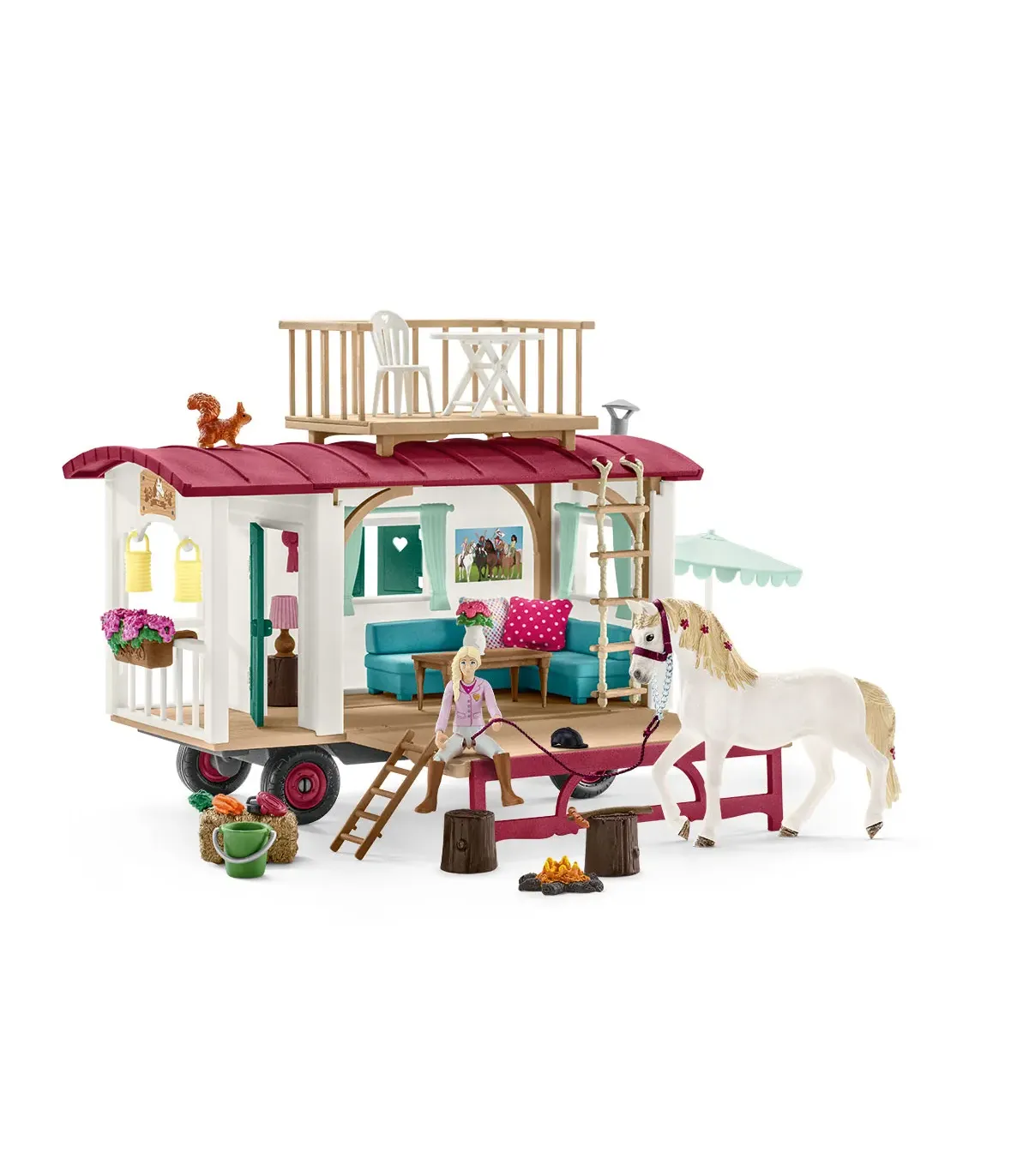 1 figura totalmente articulada, 1 Yegua andaluza, 1 ardilla, 1 caravana, 2 faroles, 1 escalera, 1 silla, 1 sombrilla, 1 mesa de terraza, 1 sofá, 1 mesa de salón, 1 lámpara, 1 jardinera, 1 escalera de cuerda, 2 lazos de victoria, 1 silla de montar, 1 brida, 1 riendas, 1 cabestro, 1 pesebre, 1 rascadera, 1 bruza, 1 paca de paja, 1 cubo, 1 manzanas, 2 cojines, 1 hoguera, 1 botella, 2 palos de barbacoa con salchichas, 2 tazas, 2 vasos, 1 llave, 1 maceta, 3 troncos, 1 pegatina, 1 instrucciones de montaje