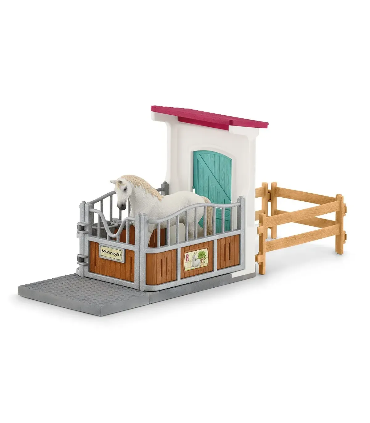 También los caballos necesitan a veces un descanso de tanta diversión. Donde mejor pueden hacerlo es en el acogedor Box para caballos de schleich® HORSE CLUB. Pueden comer en el pesebre y saciar su sed en el abrevadero. La verdad es que hay de todo, solo falta una máquina de hacer helados. Pero probablemente sea mejor así. De lo contrario, todos los caballos estarían delante del box en lugar de en la pradera. Y ya no habría tranquilidad.