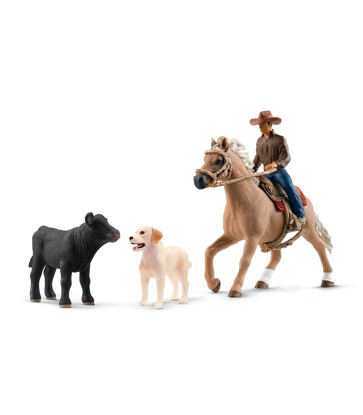 ¡Sooo! En la Equitación del Oeste de schleich® FARM WORLD, enseñarás a tu caballo desde cabalgar a toda velocidad hasta pararse, con una sola mano. La otra puedes tenerla ocupada con cosas como pasteles. Y por supuesto con un lazo auténtico.