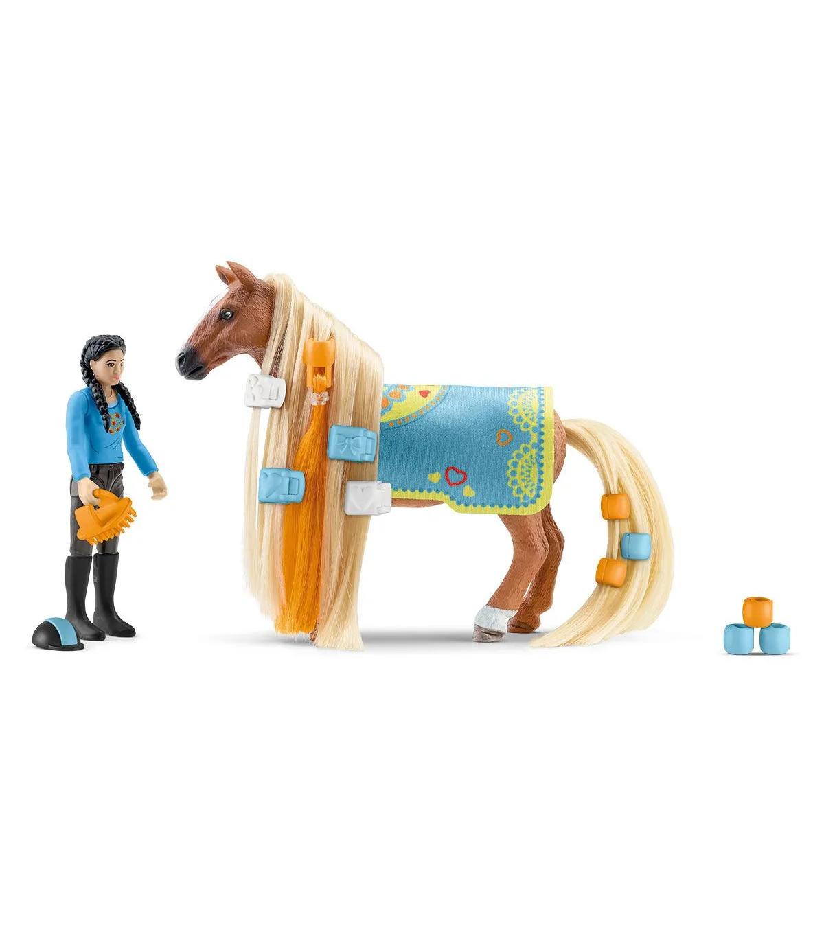 Descubre el Set de iniciación Kim y Caramelo de schleich®HORSE CLUB Sofia's Beauties. Kim y su yegua Criolla Definitiva Caramelo nunca están lejos. Estos íntimos amigos están juntos las 24 horas del día. Y eso es muchísimo. Lo que más les gusta es pasar el tiempo hablando de la última fiesta del establo. O del color azul. El jersey azul, la manta azul, las pinzas azules para el pelo... Como ves, es el color favorito de los dos. Para que Kim, que es una figura totalmente articulada, no tenga que elegir un solo tono azul, puedes cambiar fácilmente la crin y la cola de su yegua. Y peinarlas tranquilamente. ¿A que es muy práctico?