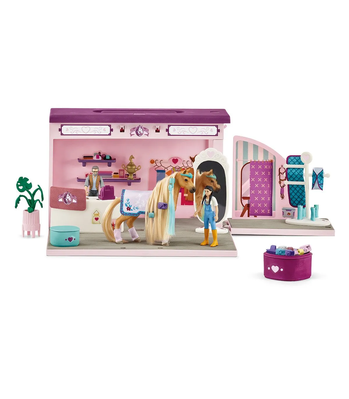 La Boutique Pop-up de schleich® HORSE CLUB Sofia's Beauties tiene estupendas mantas y accesorios de todos los colores. Así que encontrarás de todo para cada caballo. ¿Te has dado cuenta de que no solo puedes trenzar y peinar las crines y colas, sino también cambiarlas? Así que Sofia y su yegua no tienen que elegir solo un peinado. Perfecta para cualquier sesión de fotos. Incluso si se hace en el parque que está detrás de tu casa. Podrás plegar fácilmente toda la boutique y llevártela allí. ¡Así que, por favor, estaos todos quietos y decid «patata»!