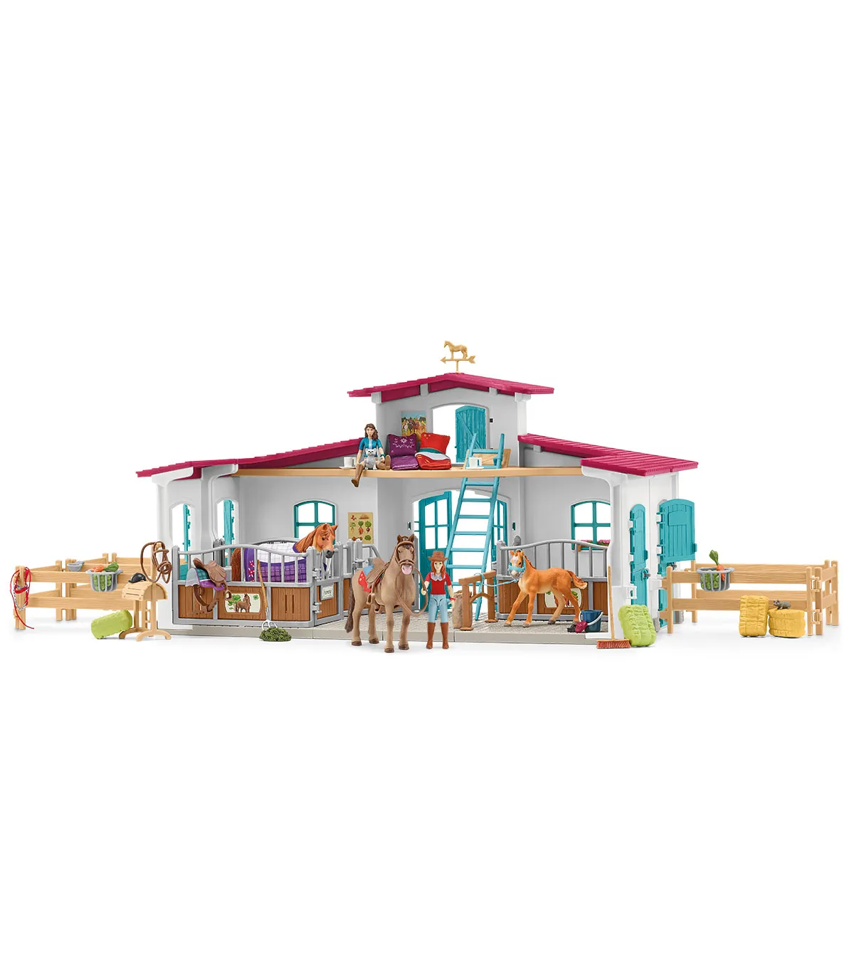 Ensilla los caballos y ¡adelante! Pero antes deberás terminar el trabajo en el establo: es divertidísimo con la Granja de caballos de schleich® HORSE CLUB, donde encontrarás todo lo que tú y la jinete necesitáis. Con el cepillo de masaje, el rascador de pezuñas y la rascadera, la Yegua árabe y su potro estarán arreglados en el box de limpieza en un periquete. Después, los caballos que se hayan portado bien podrán ser recompensados con una zanahoria o una manzana. O con un día en el parque acuático con toboganes. Y si queréis dejar recogido todo antes, con la horca el establo estará impecable más rápido de lo que tardas en decir impecable. Para que puedan brillar todos los colores de la casa del caballo. ¿Quieres brillar tú también?