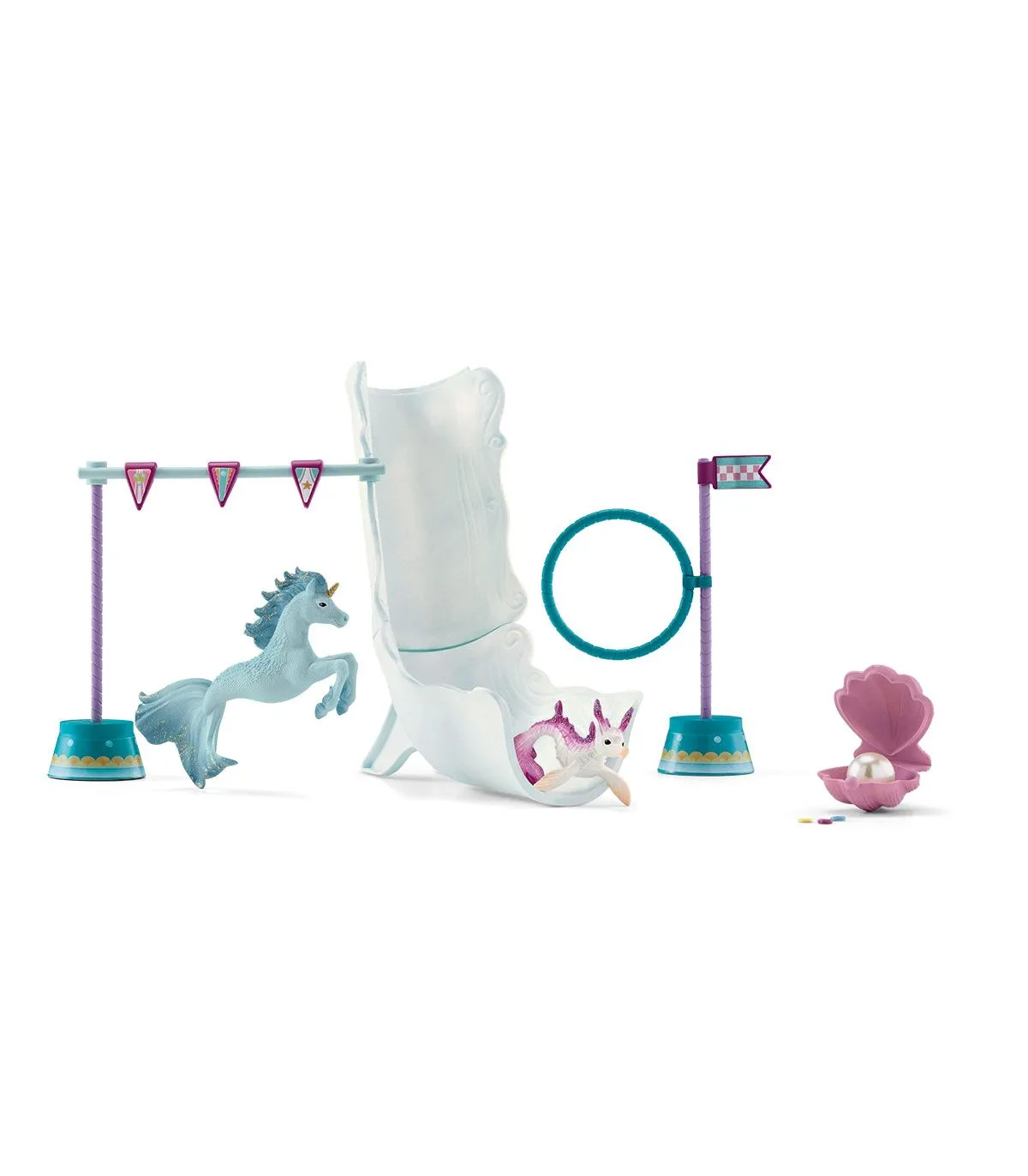 ¡Preparados, listos, ya! En el Campeonato mágico submarino de schleich® BAYALA® podrás practicar muy bien tus gritos de alegría. En la carrera de obstáculos, los competidores tienen que pasar por encima de la barra, por el aro o por debajo del túnel. Y en el tobogán mágico, el ganador no es quien se desliza más rápido, sino quien grita más fuerte «¡Yujuuu!». Así que: ¡Yujuuu!