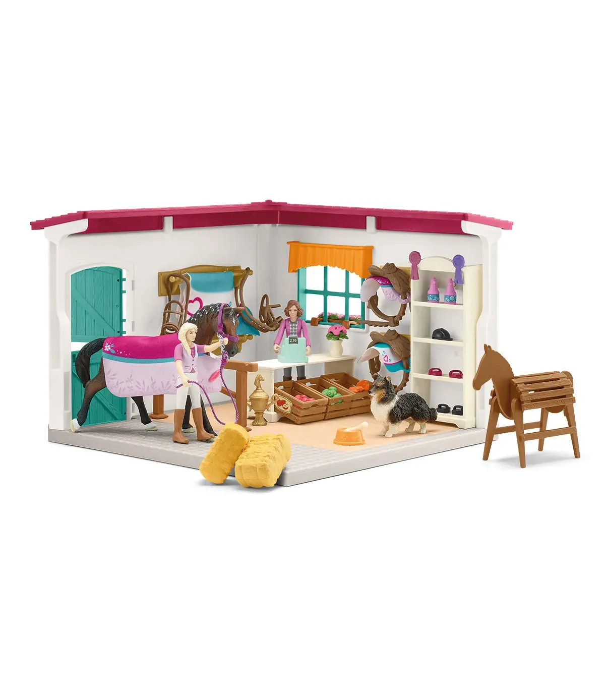 ¡Ding dong! ¡Han entrado clientes! La gente entra en la Tienda de equitación de schleich® HORSE CLUB a curiosear durante horas y sale con una sonrisa. Porque han encontrado algo realmente bueno para su caballo, o porque la mujer de la caja les ha hecho un cumplido. En su tienda solo se vende lo mejor. Comida, sillas de montar, cepillos, un perro... y sí, tal vez incluso la pinza para el pelo que has perdido.