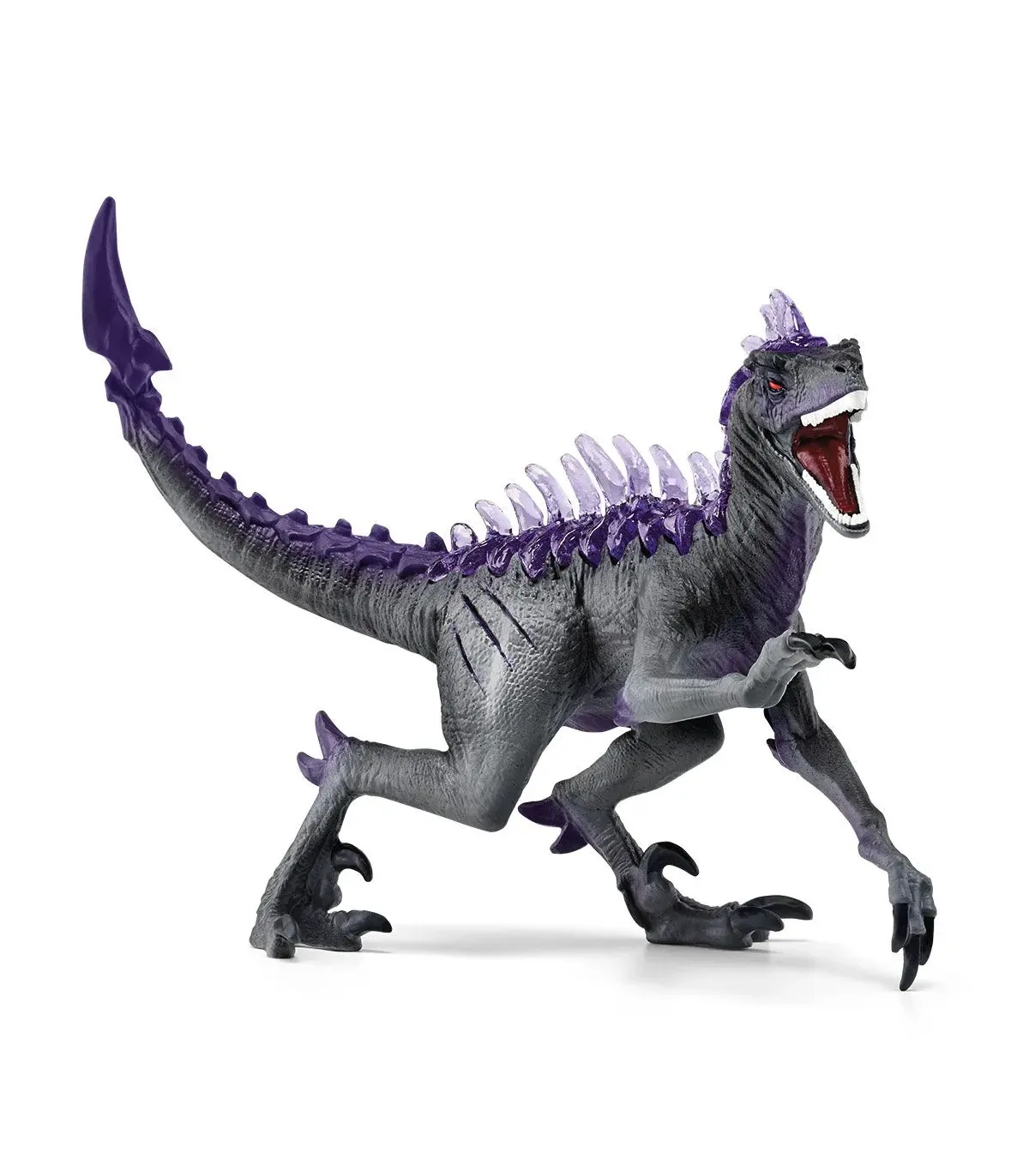 El Raptor de sombra tiene fama de ser el monstruo prehistórico más temible de Eldrador. Y seguro que con razón, porque ¿quién querría ser triturado por su poderosa mandíbula? Mira fijamente a sus adversarios con sus amenazadores ojos rojos. Las afiladas púas de su espalda son muy peligrosas y su columna vertebral transparente brilla con un terrorífico color violeta. ¡Vámonos de aquí!