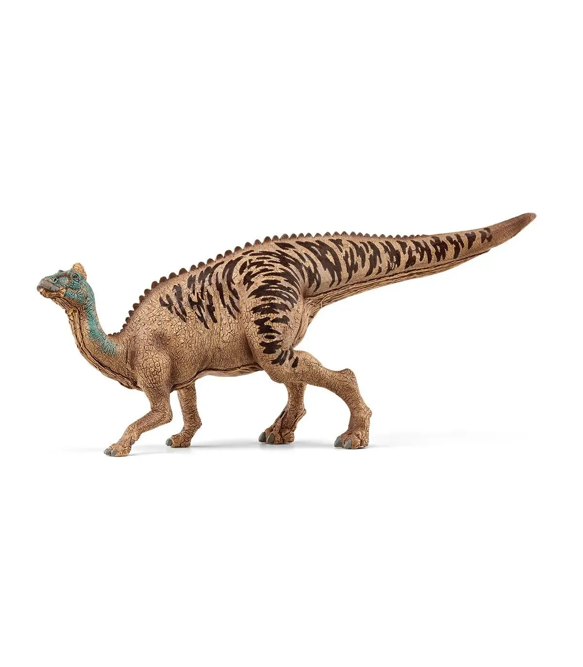 El Edmontosaurus es un auténtico gigante de 13 metros, pero es muy simpático. Te das cuenta enseguida. Y también es bonito: tiene una llamativa cresta de gallo en la cabeza y un cuello largo. Lo que más le gusta es pasear tranquilamente por el bosque y los prados y mordisquear un poco los arbustos. Pero, como es tan grande, tarda mucho tiempo en terminar de comerse las hojas y las ramas. ¿Por qué no le haces compañía?
