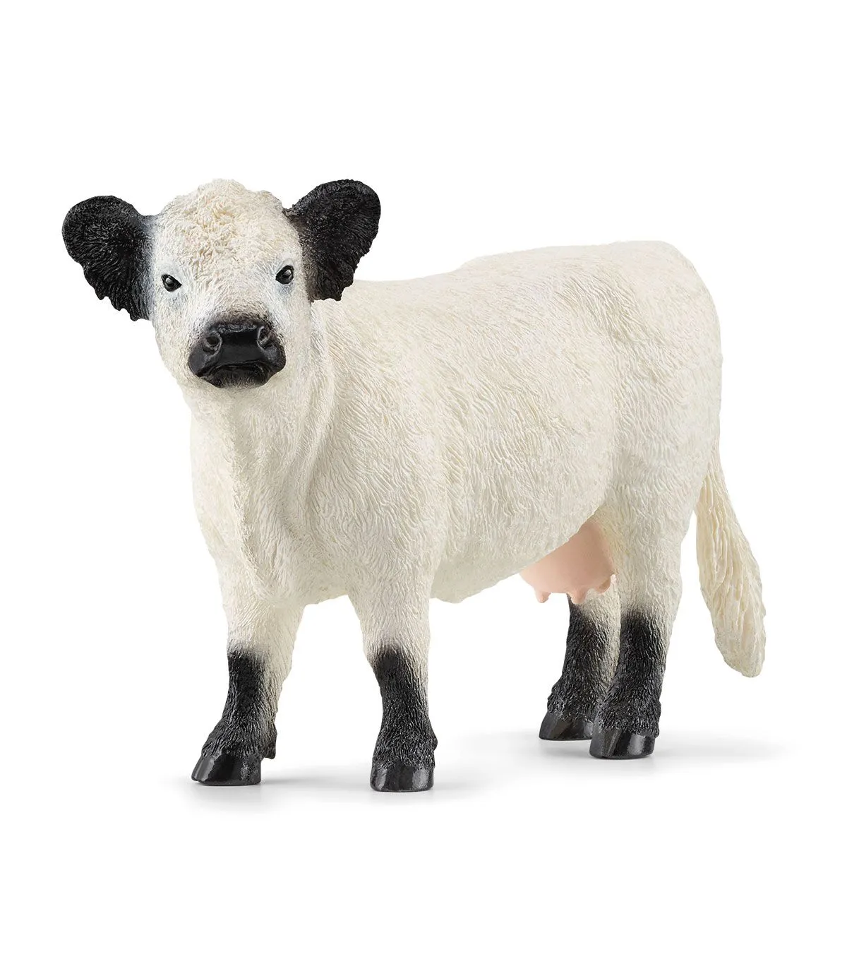 ¡La Vaca Galloway blanca, con sus orejas y pezuñas negras y su gracioso hocico, es preciosa! Su grueso pelaje la mantiene caliente, por lo que puede permanecer en el exterior incluso en los inviernos más gélidos. ¡Pero seguro que aceptará encantada si le haces sitio en tu habitación!