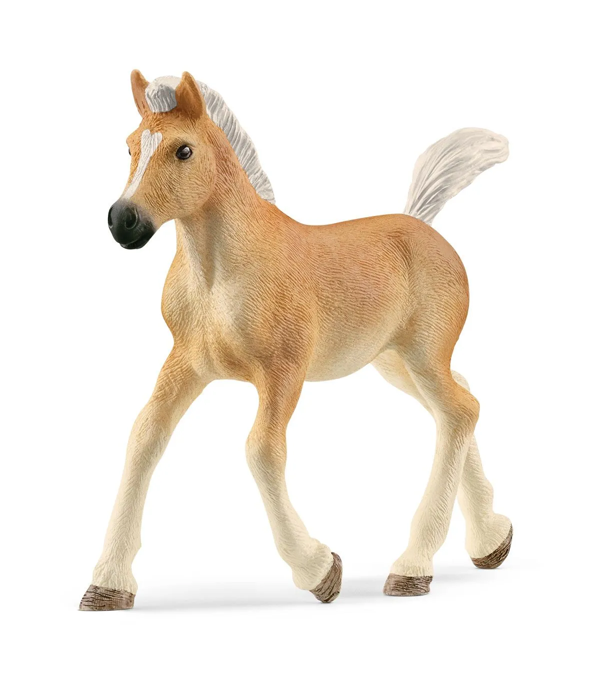 Al pequeño potro se le nota ya que algún día se convertirá en un gran Haflinger. Tiene el típico pelaje de color crema y la crin blanca como la nieve. Incluso la corta cola es completamente blanca. Trota alegremente por la pradera con las orejas erguidas. ¿Hará nuevos amigos?