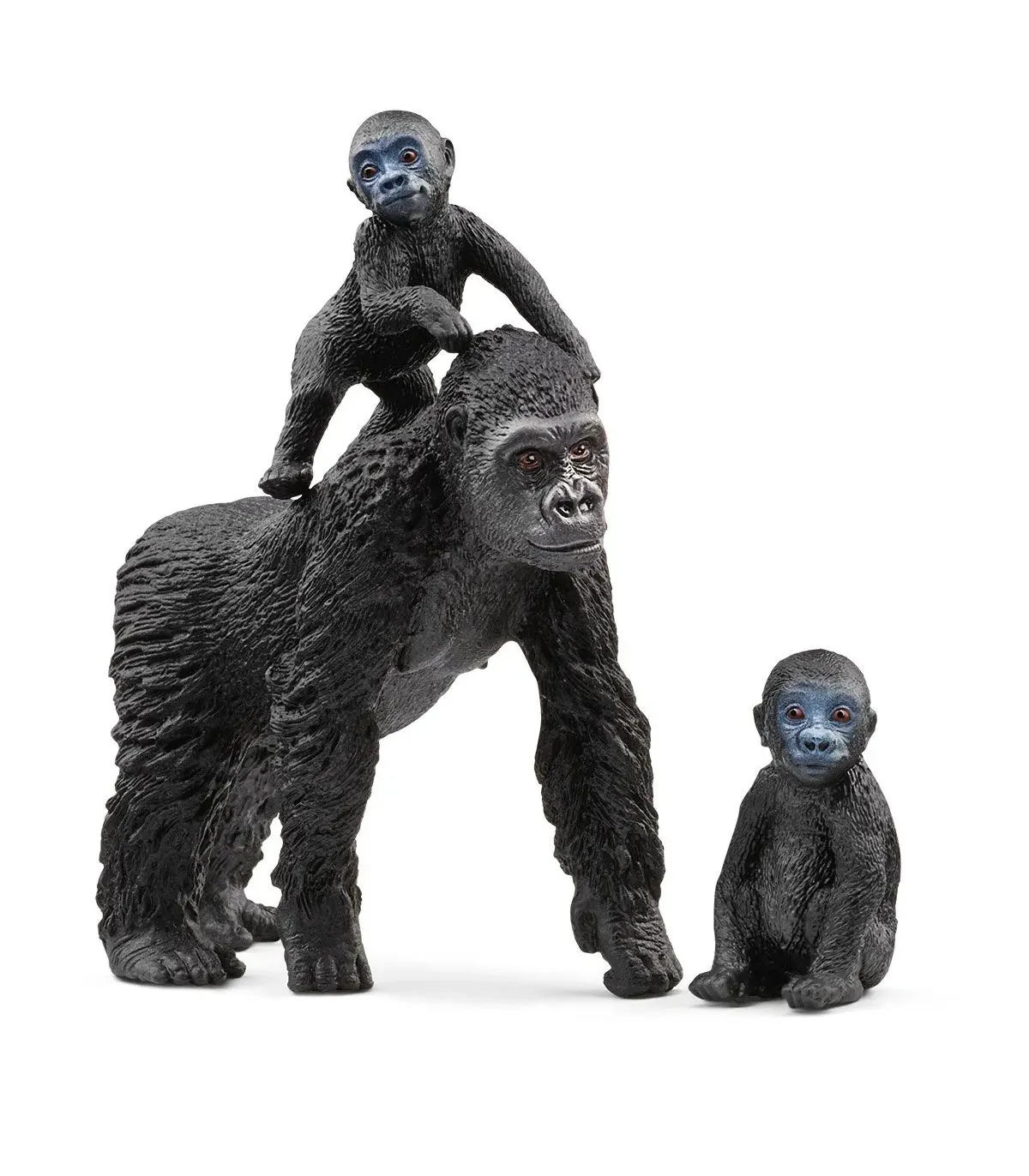 ¡Qué adorable familia de gorilas de llanura! La madre vigila a sus dos pequeños. Uno de ellos parece cansado. Tiene sueño y está sentado en el suelo. A lo mejor necesita dormir la siesta. En cambio, la otra cría está muy espabilada y quiere subirse a la espalda de su madre. Sus brazos se ajustan exactamente a la espalda de la madre. Así es imposible que se caiga.
