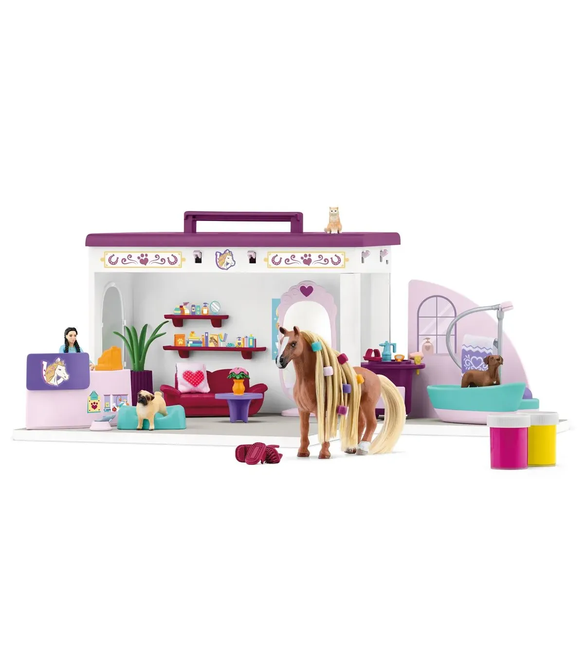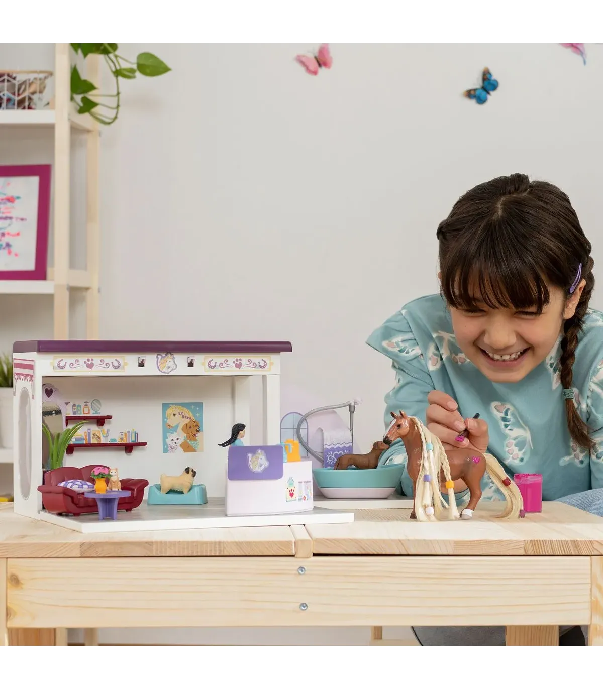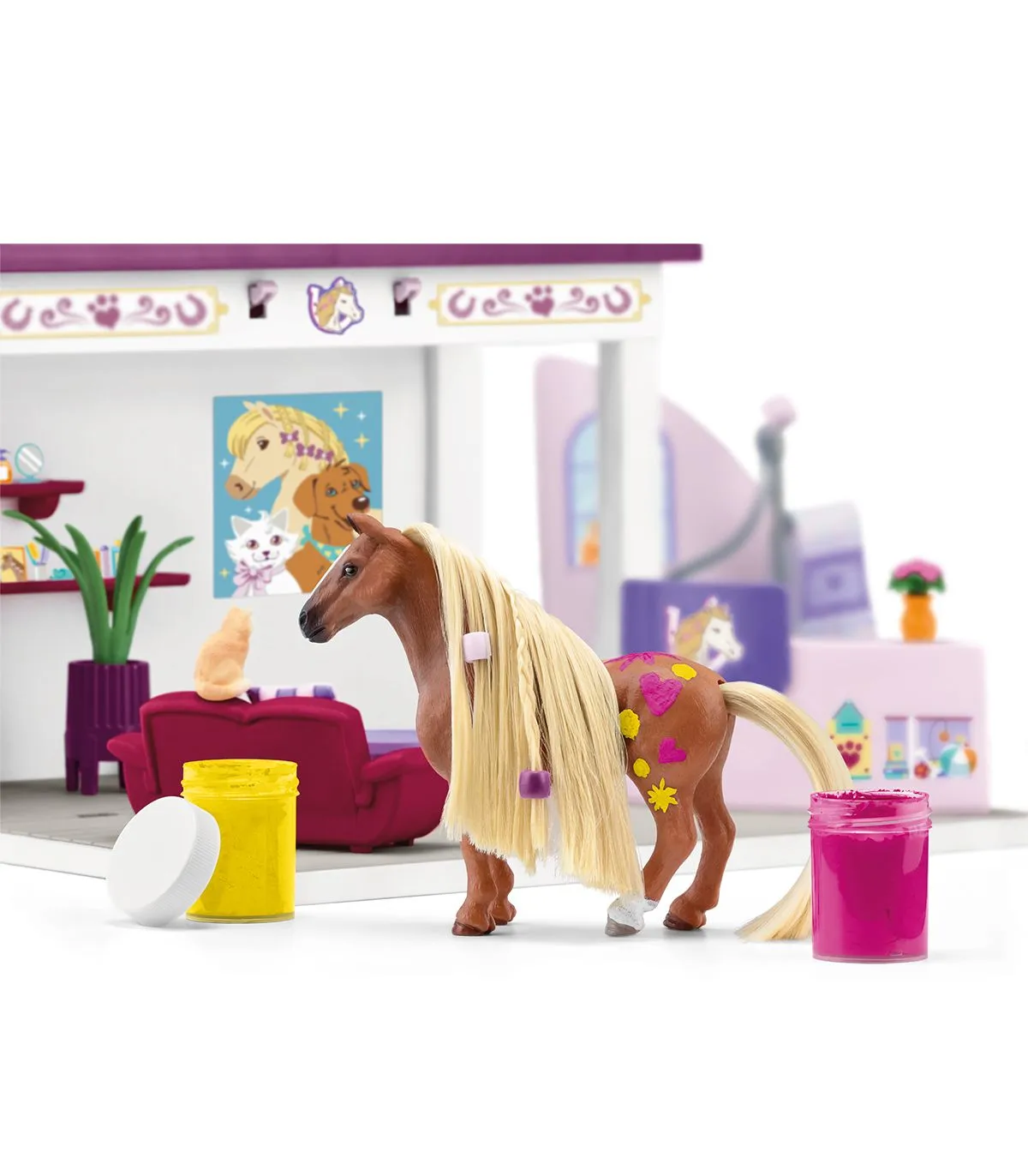 En el salón de belleza, las mascotas reciben un verdadero tratamiento de SPA. Mientras el perro y el gato siguen esperando en la sala de espera, al caballo ya le están lavando el pelaje con agua de verdad. Aquí se eliminan del todo los dibujos antiguos para que todo esté listo para el nuevo look. La crin se peina y se trenza con el cepillo. El bonito peinado puede adornarse con tantas pinzas para el pelo como se desee. Pero eso no es todo: ¿por qué no adornas también el pelaje? Se pueden pintar diseños llenos de imaginación en el cuerpo con la pintura especialmente fabricada para ello. La próxima vez que vayasal SPA, solo tendrás que quitarlos con agua y así dejarás espacio para un nuevo diseño.
