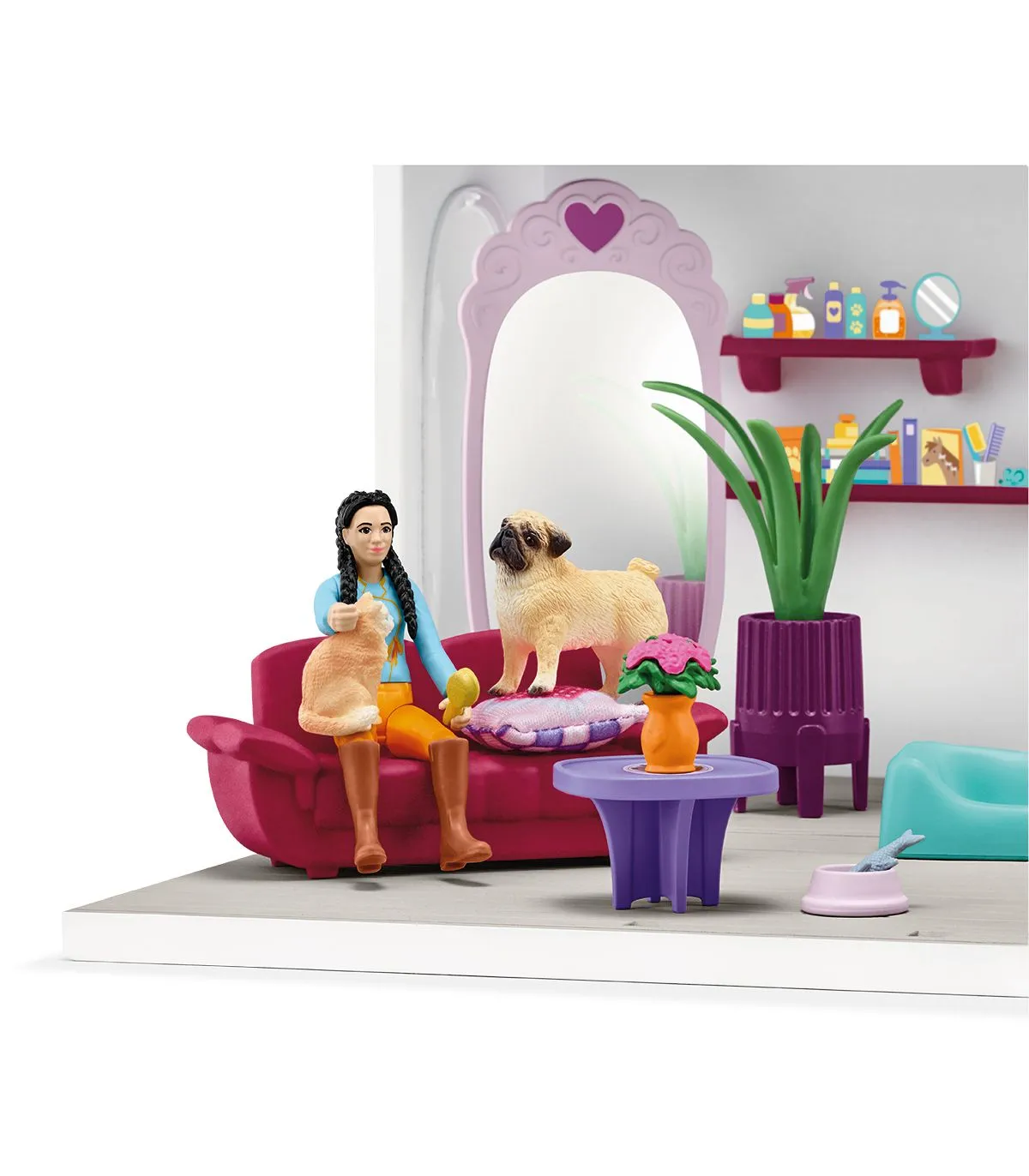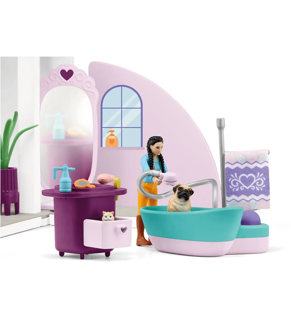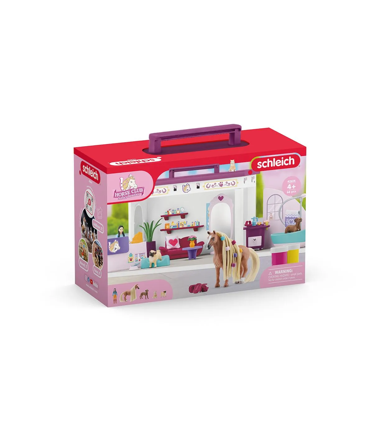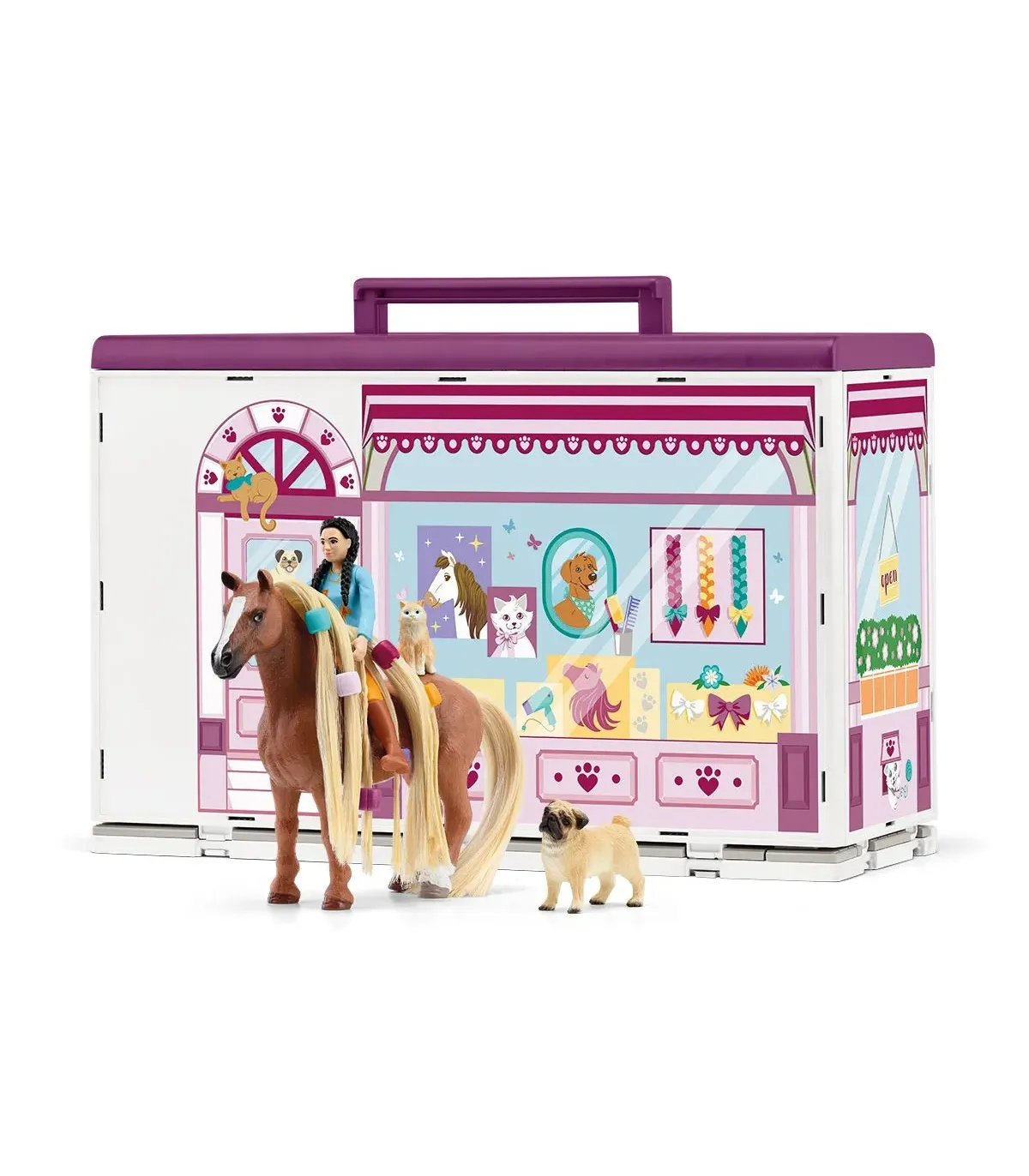 En el salón de belleza, las mascotas reciben un verdadero tratamiento de SPA. Mientras el perro y el gato siguen esperando en la sala de espera, al caballo ya le están lavando el pelaje con agua de verdad. Aquí se eliminan del todo los dibujos antiguos para que todo esté listo para el nuevo look. La crin se peina y se trenza con el cepillo. El bonito peinado puede adornarse con tantas pinzas para el pelo como se desee. Pero eso no es todo: ¿por qué no adornas también el pelaje? Se pueden pintar diseños llenos de imaginación en el cuerpo con la pintura especialmente fabricada para ello. La próxima vez que vayasal SPA, solo tendrás que quitarlos con agua y así dejarás espacio para un nuevo diseño.