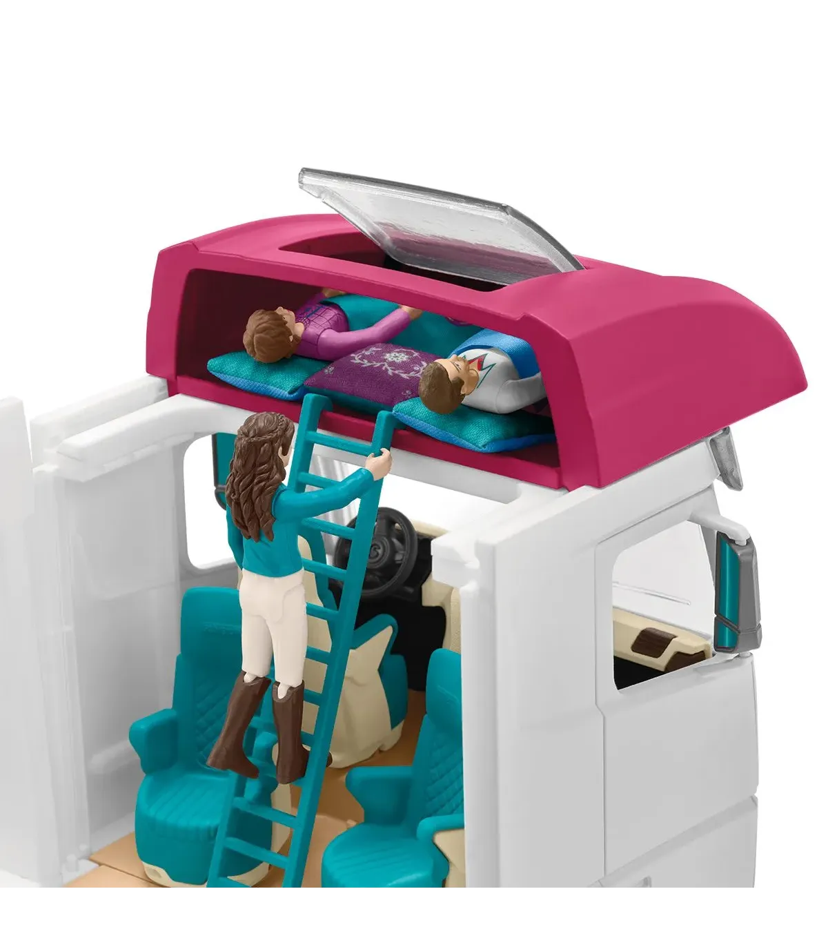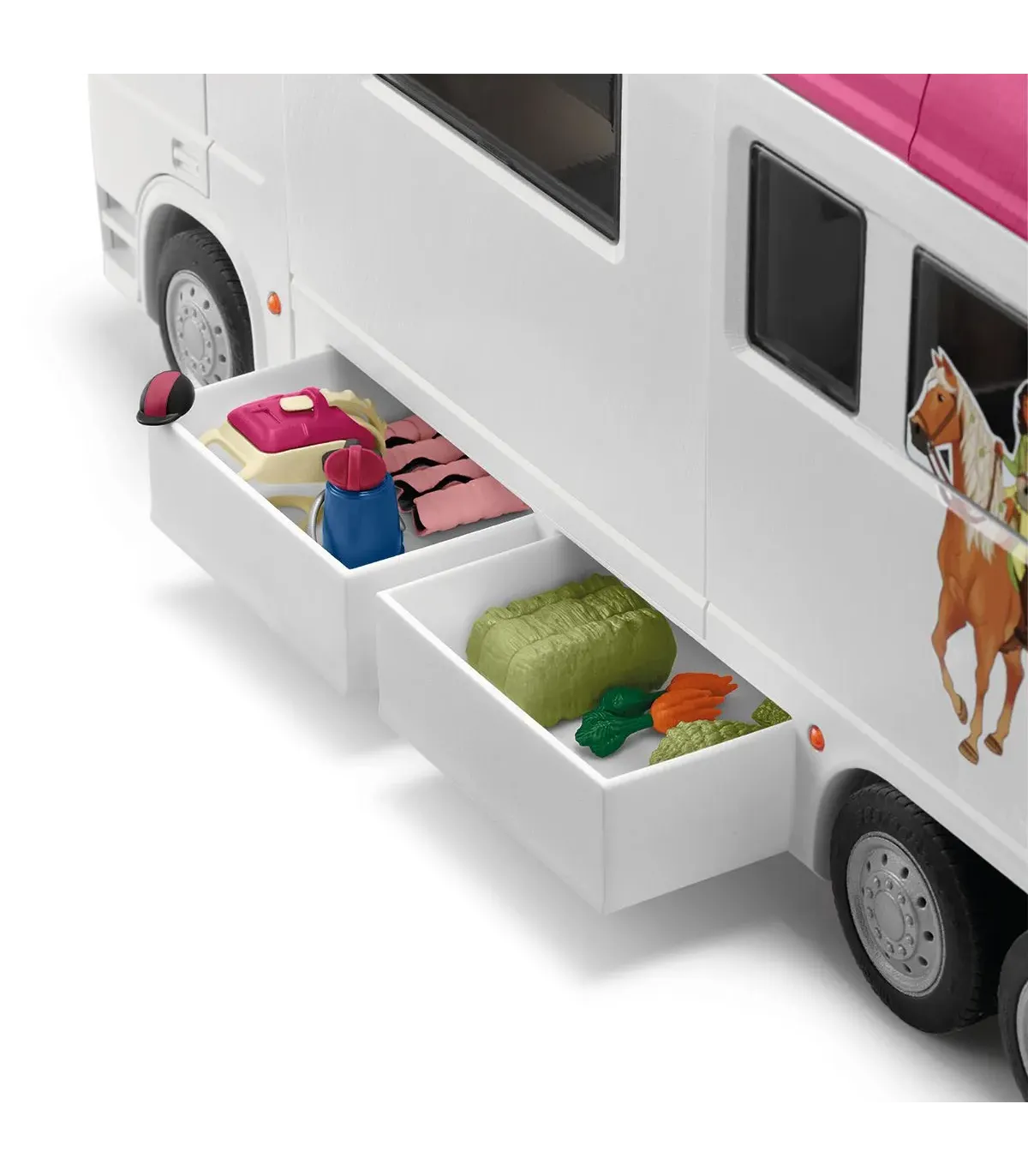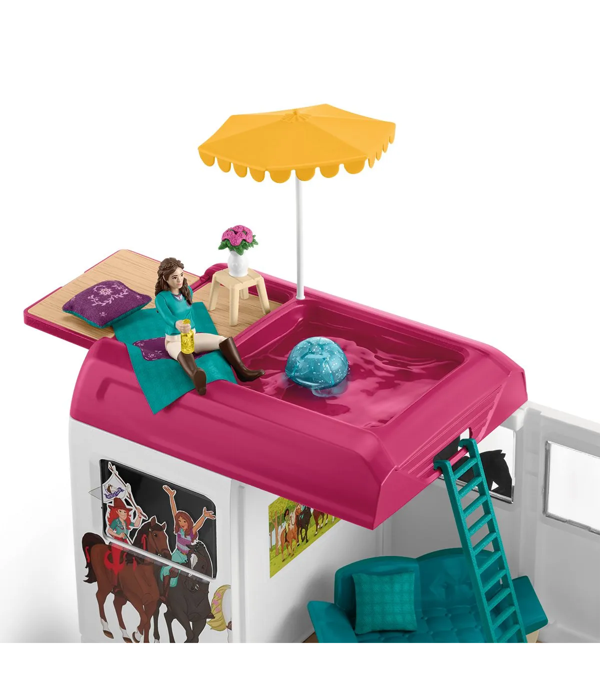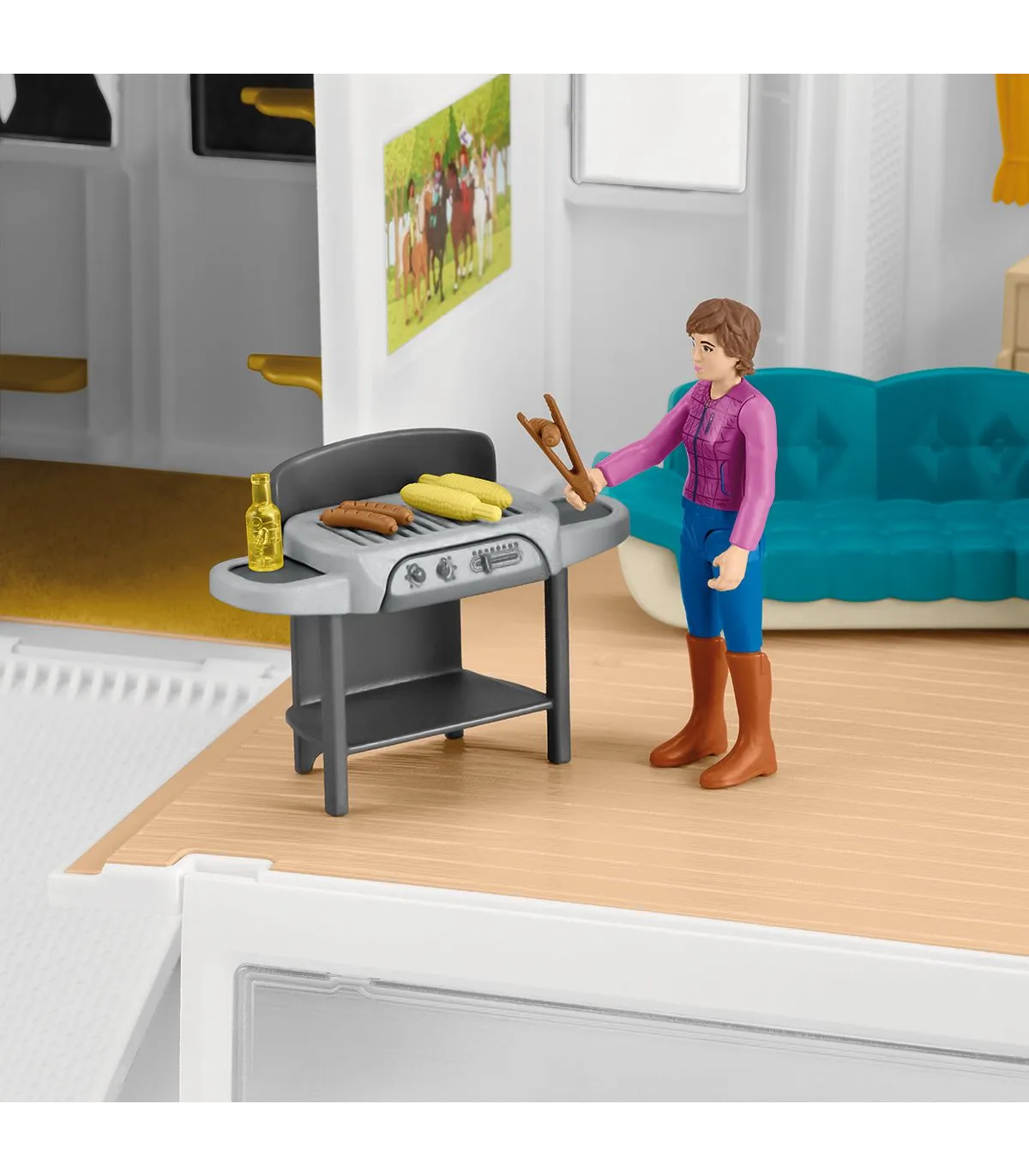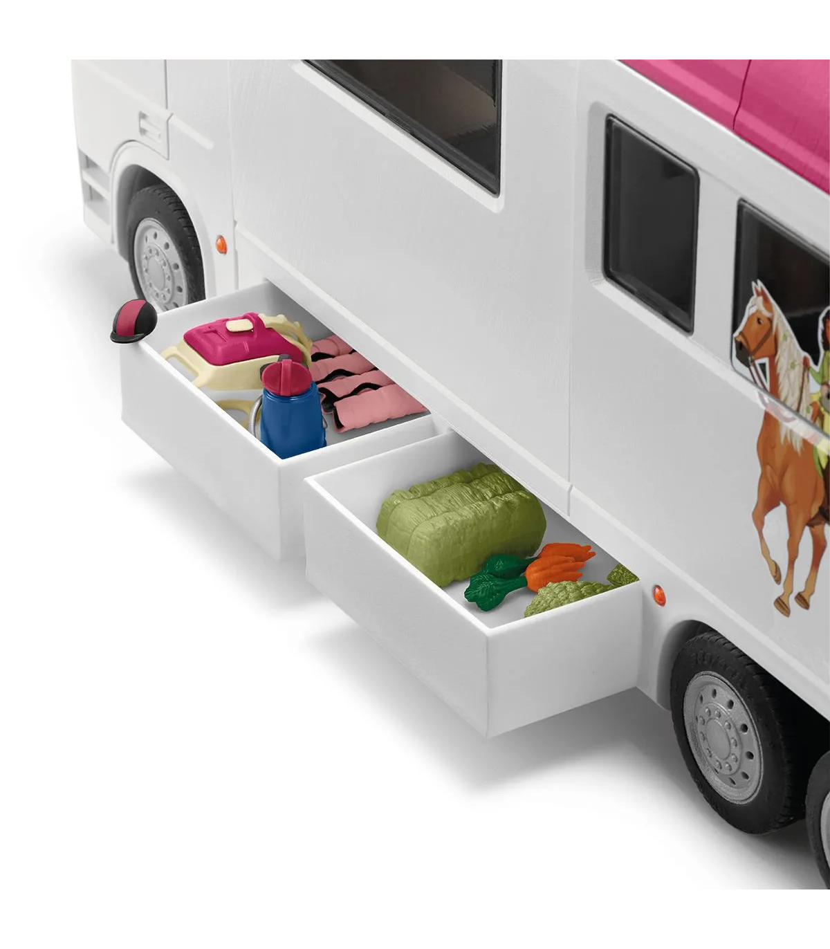 ¡Increíble, esta autocaravana con zona de caballos está llena de sorpresas! A bordo encontrarás todo lo que necesitan Lisa y su familia para trasladarse al siguiente concurso ecuestre con hasta cuatro caballos. Durante el viaje no les faltará de nada y los caballos irán muy seguros en sus boxes. Cuando lleguen a su destino encontrarán un prado fantástico preparado con vallas. Para prepararse de cara al concurso pueden entrenar incluso durante el viaje con los obstáculos que llevan consigo. Lisa no se cansa de idear nuevos ejercicios. ¿Y sus padres? Aprovechan para disfrutar de la piscina del techo. Más tarde, se reúnen para preparar unas salchichas y mazorcas de maíz en la barbacoa.