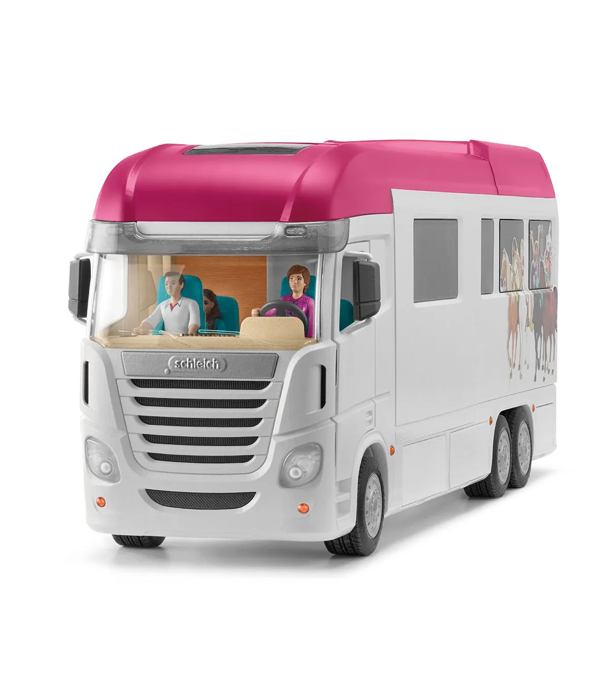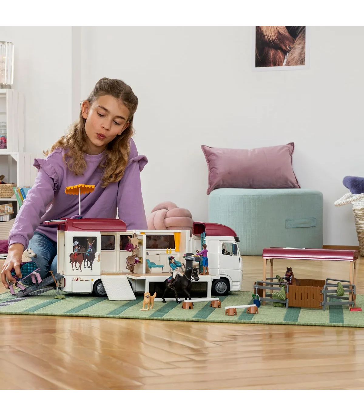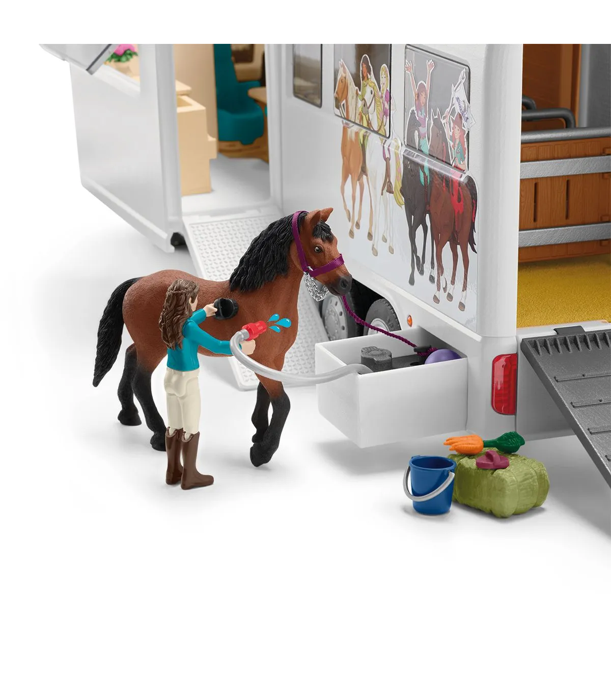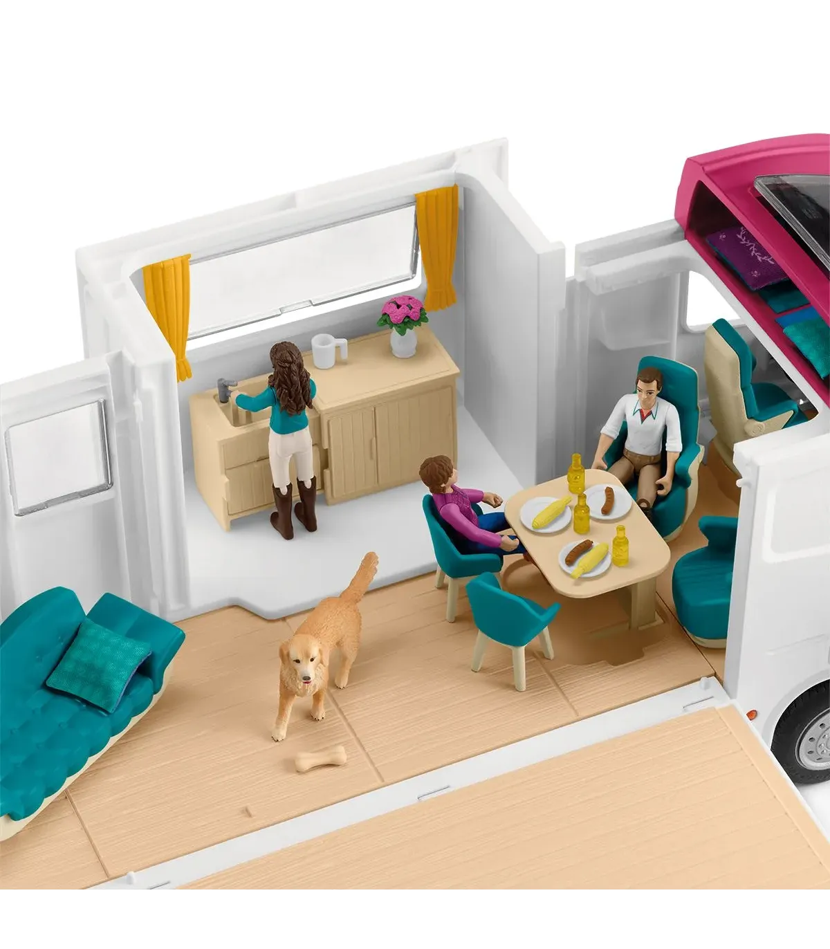 ¡Increíble, esta autocaravana con zona de caballos está llena de sorpresas! A bordo encontrarás todo lo que necesitan Lisa y su familia para trasladarse al siguiente concurso ecuestre con hasta cuatro caballos. Durante el viaje no les faltará de nada y los caballos irán muy seguros en sus boxes. Cuando lleguen a su destino encontrarán un prado fantástico preparado con vallas. Para prepararse de cara al concurso pueden entrenar incluso durante el viaje con los obstáculos que llevan consigo. Lisa no se cansa de idear nuevos ejercicios. ¿Y sus padres? Aprovechan para disfrutar de la piscina del techo. Más tarde, se reúnen para preparar unas salchichas y mazorcas de maíz en la barbacoa.