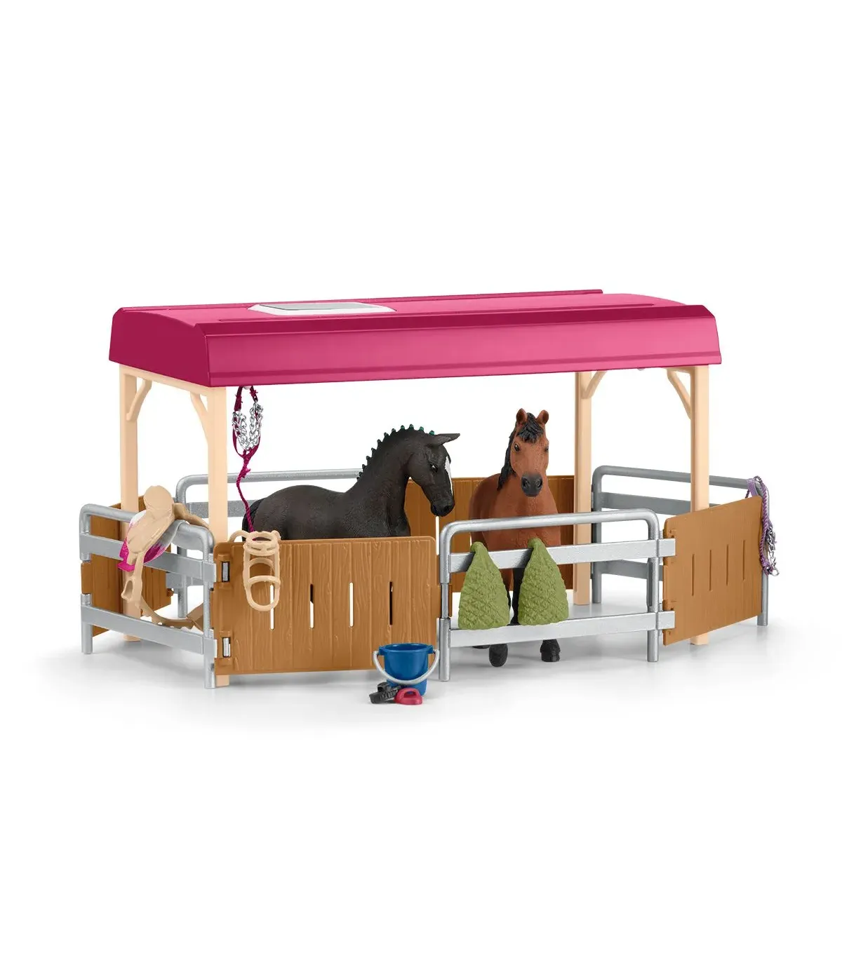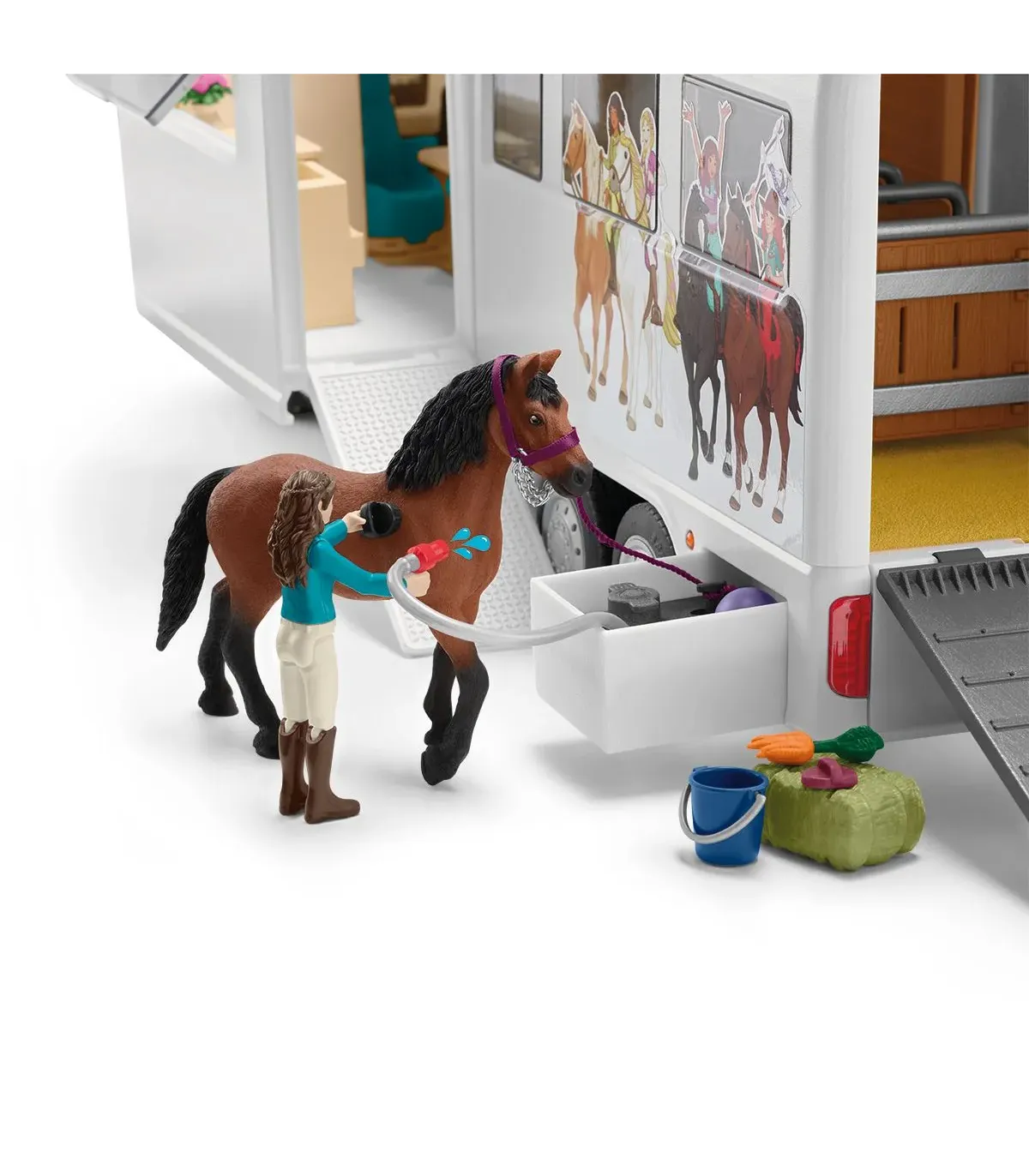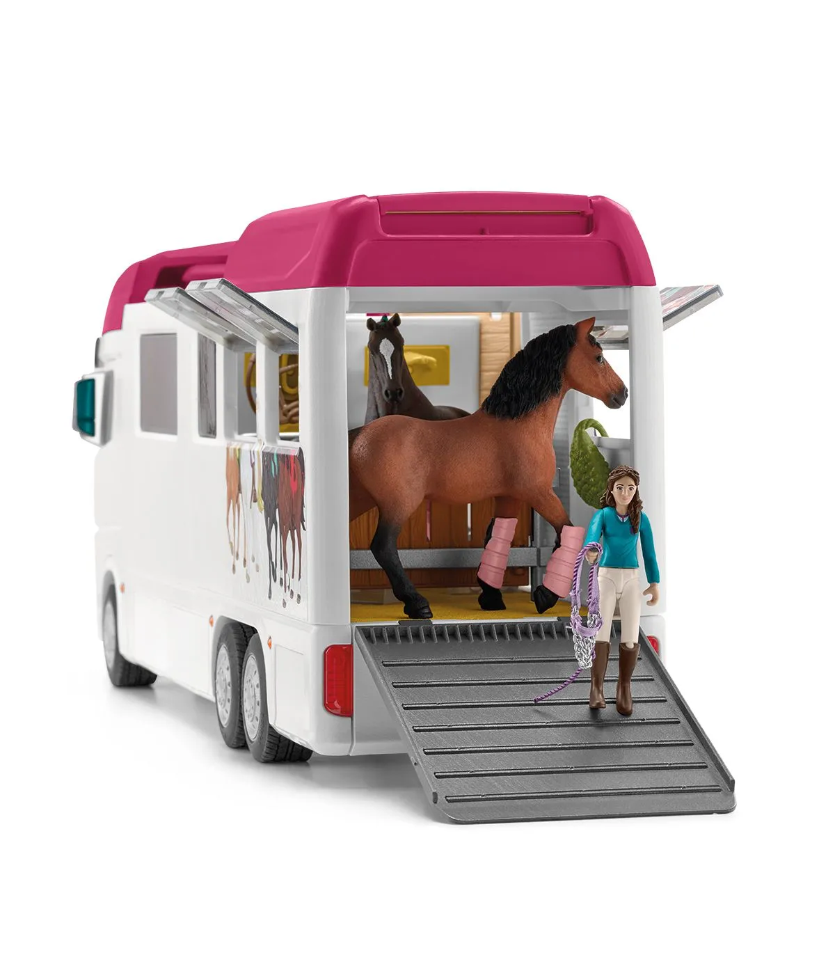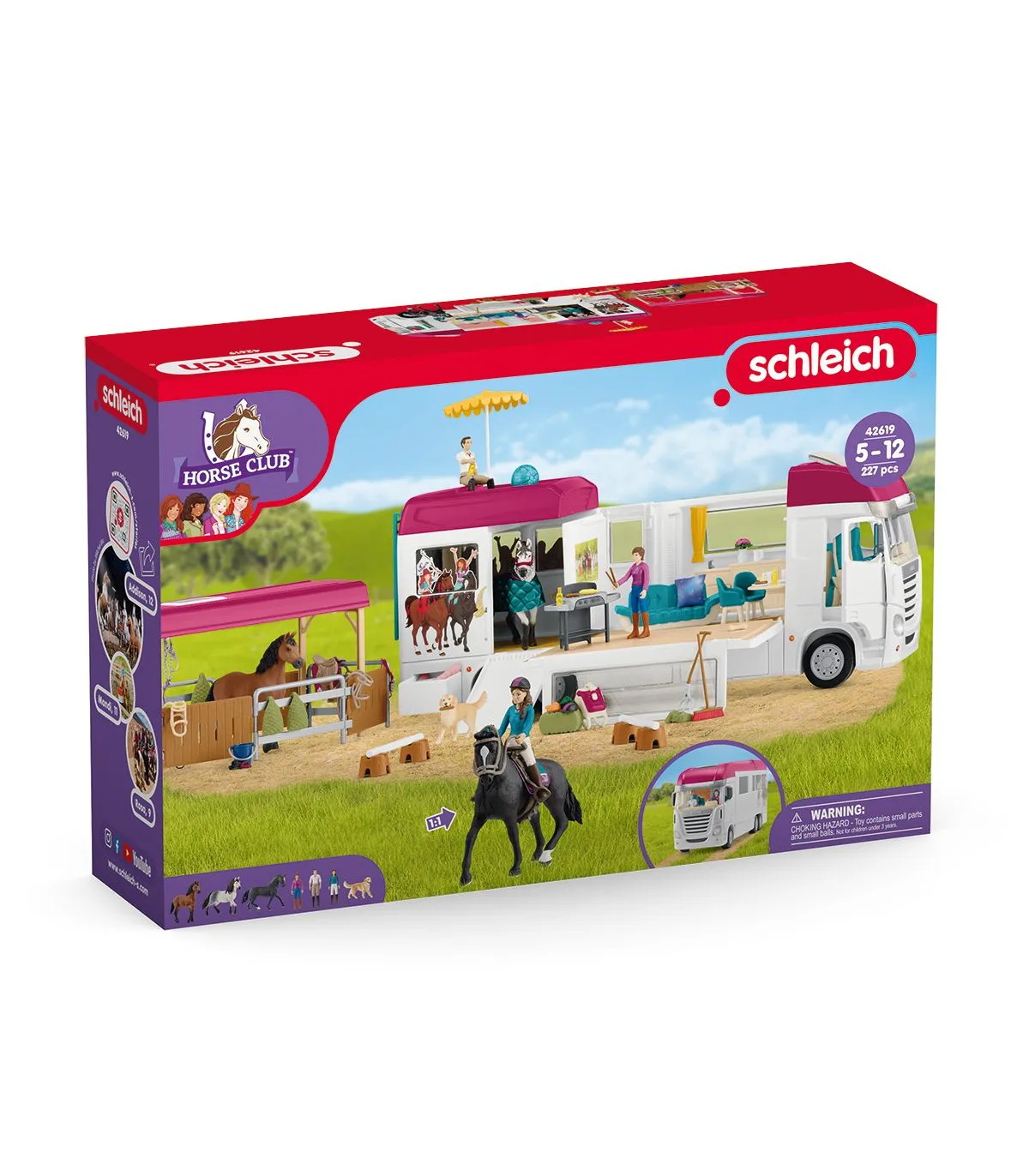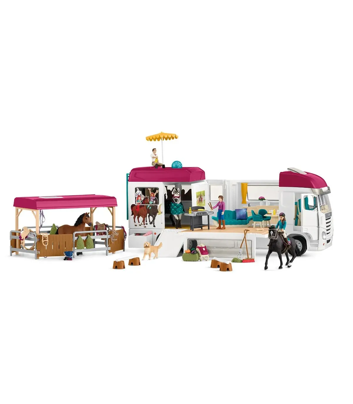 ¡Increíble, esta autocaravana con zona de caballos está llena de sorpresas! A bordo encontrarás todo lo que necesitan Lisa y su familia para trasladarse al siguiente concurso ecuestre con hasta cuatro caballos. Durante el viaje no les faltará de nada y los caballos irán muy seguros en sus boxes. Cuando lleguen a su destino encontrarán un prado fantástico preparado con vallas. Para prepararse de cara al concurso pueden entrenar incluso durante el viaje con los obstáculos que llevan consigo. Lisa no se cansa de idear nuevos ejercicios. ¿Y sus padres? Aprovechan para disfrutar de la piscina del techo. Más tarde, se reúnen para preparar unas salchichas y mazorcas de maíz en la barbacoa.