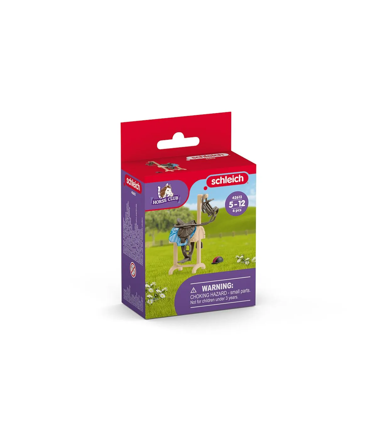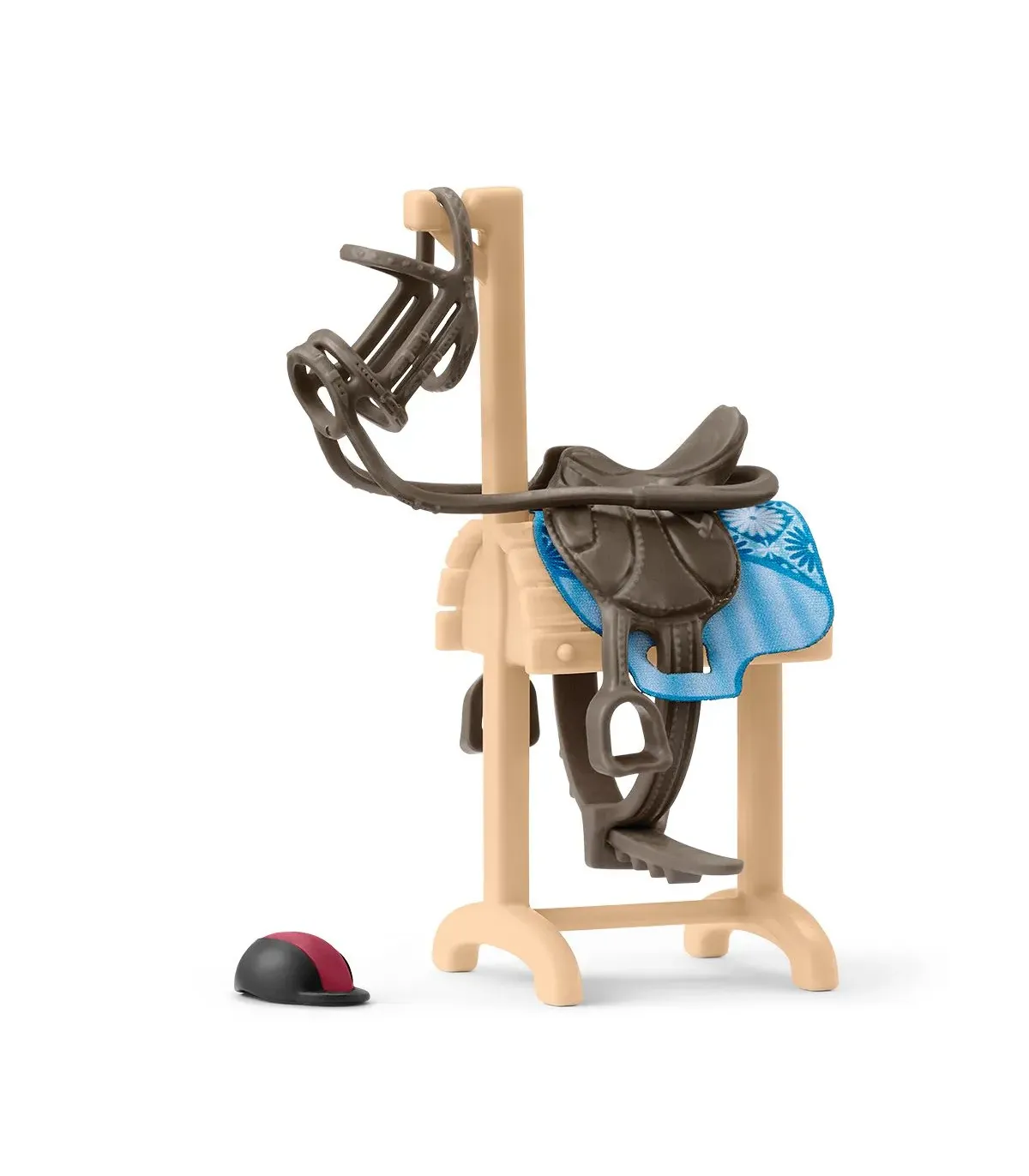¡Una silla de montar en buenas condiciones es muy importante! Y no solo para sentarse cómodamente cuando se monta a caballo. También debe mantener su forma para que no roce el lomo del caballo. Y lo mismo ocurre con las bridas. ¡Menos mal que hay un accesorio especial para conseguirlo! En el caballo de madera se pueden colocar perfectamente la manta y la silla de montar. Las bridas también se pueden colgar ordenadamente, y seguro que queda todavía sitio para el casco. Todo junto forma el complemento perfecto para el transportador de caballos de schleich® HORSE CLUB, que se vende por separado.