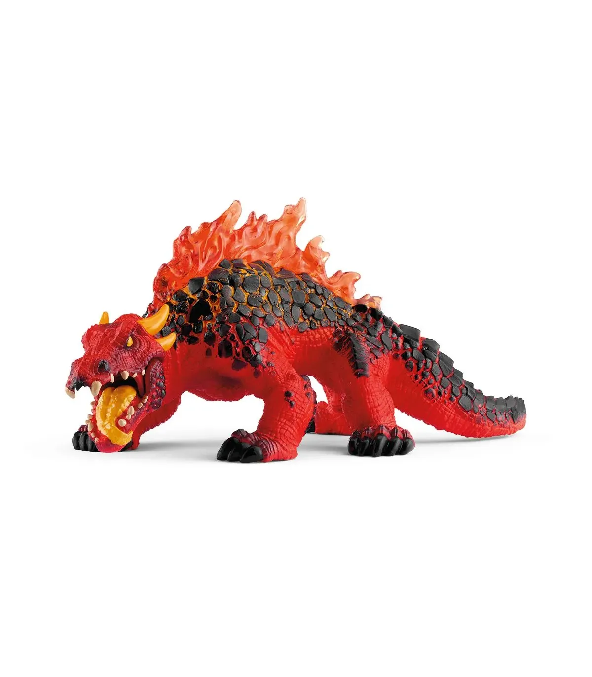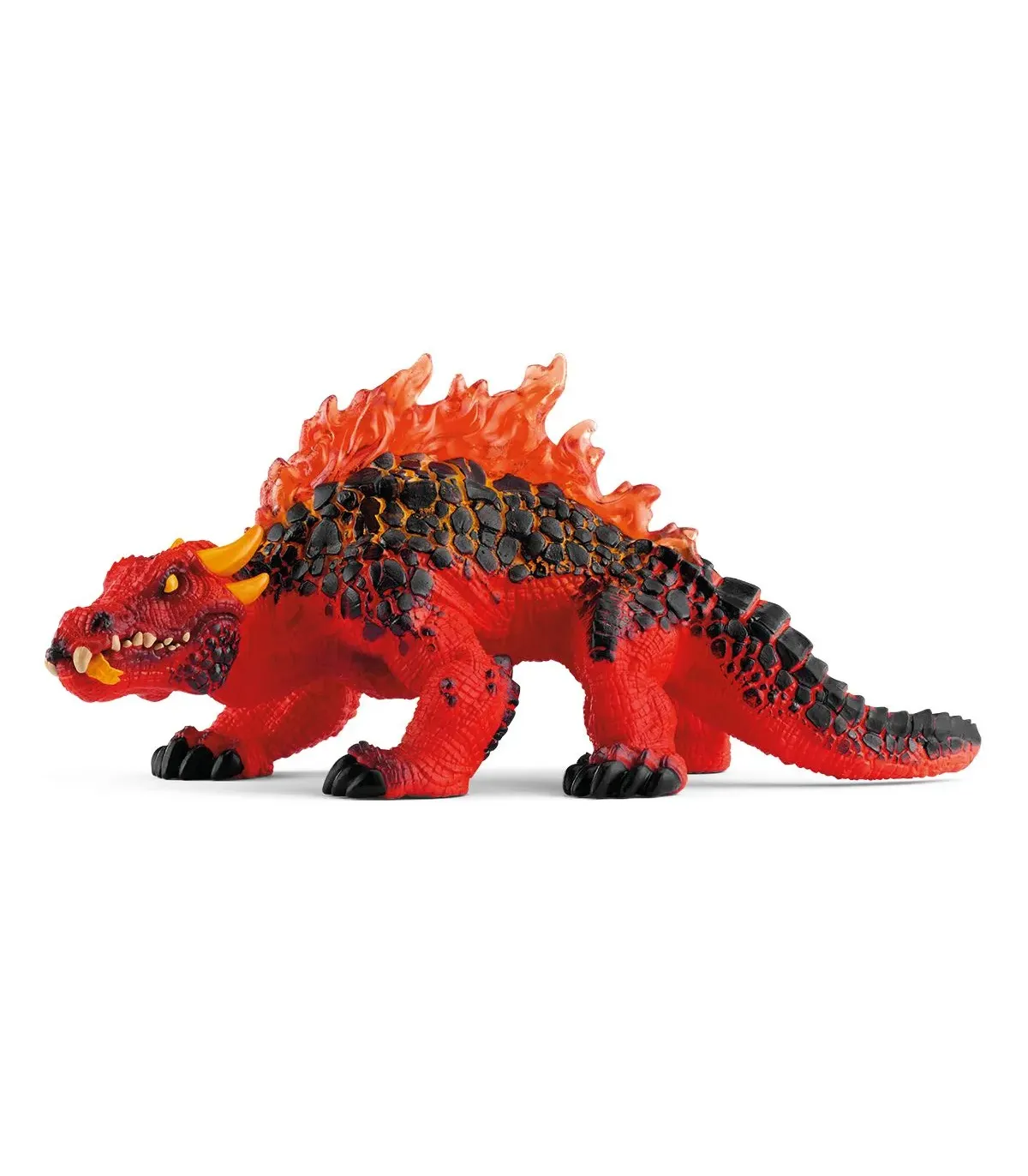 Sus ojos amarillos miran con maldad y no muestran compasión. Aunque parece un ser de fuego, el Dragón de magma tiene un corazón frío como el hielo. Quien le molesta se arriesga a recibir un siniestro bufido que sale de su poderosa nariz. Y si esto no es suficiente, abre y cierra la mandíbula amenazante, y se le ve la gruesa lengua amarilla. ¡Calma! Nadie se acerca demasiado al Dragón de magma. Sería demasiado peligroso. ¡Podría quemarse los dedos con la aleta de llamas traslúcida de su espalda!