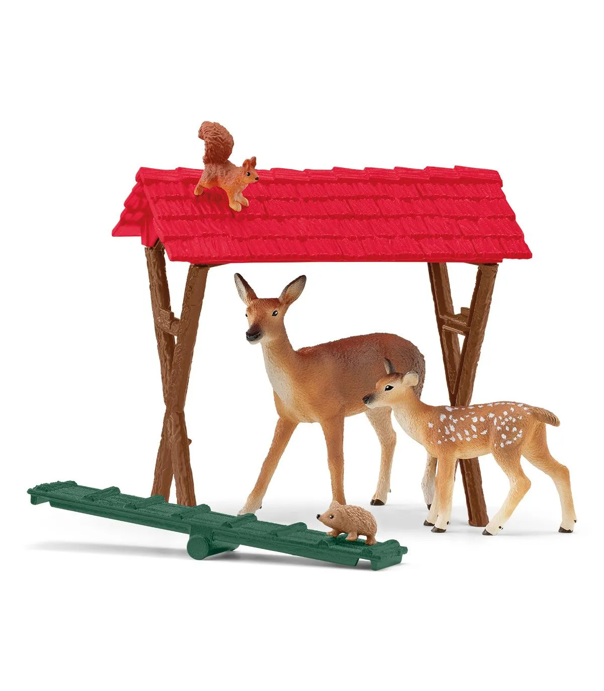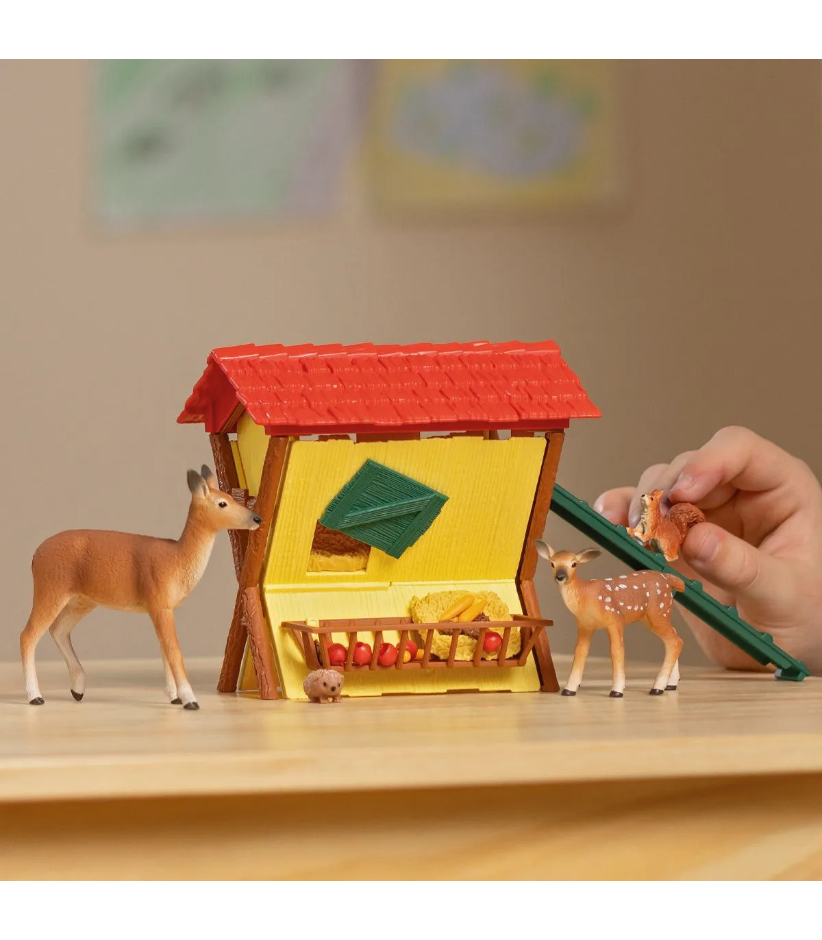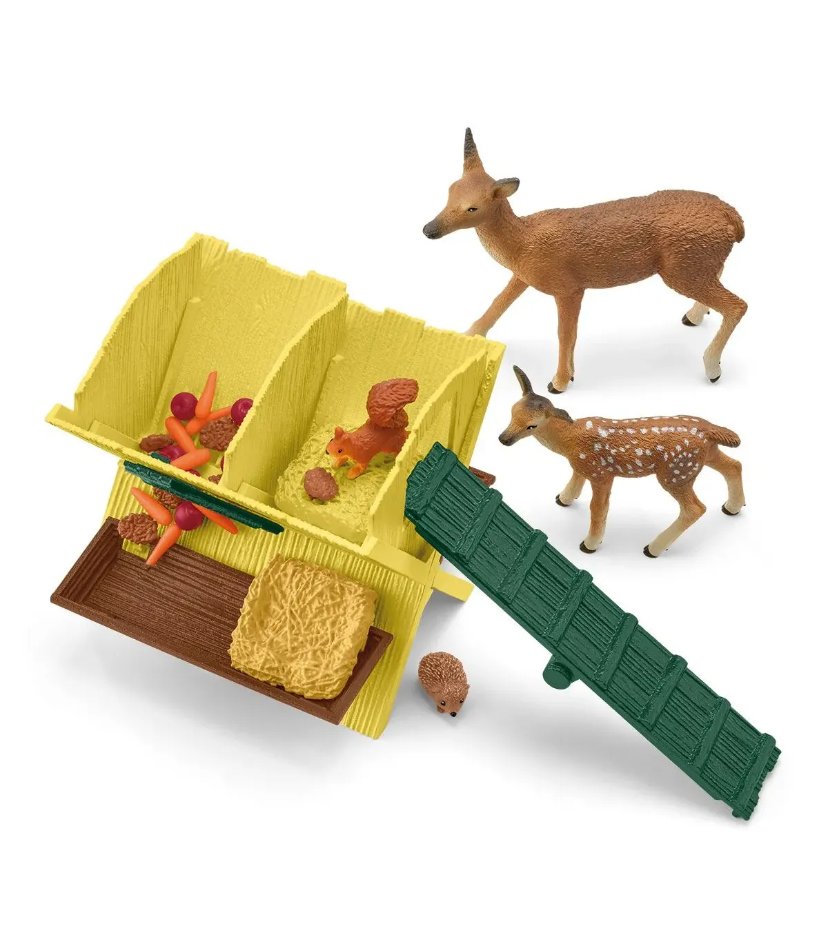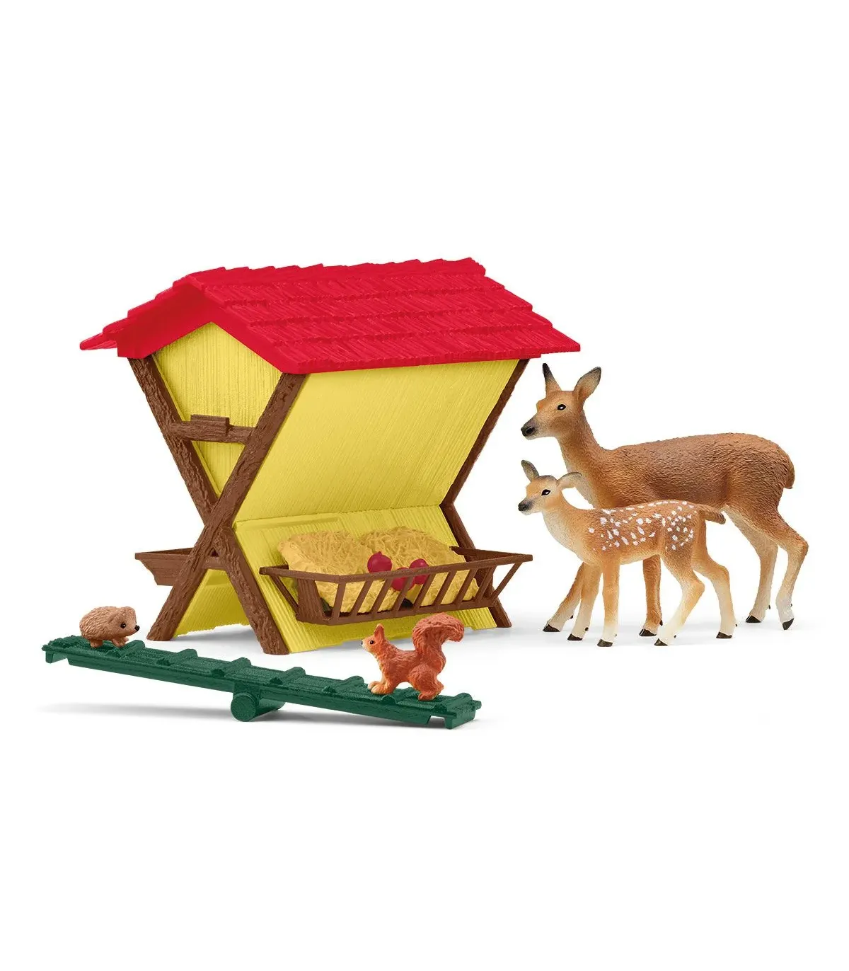 Los animales del bosque se sienten bien porque siempre encuentran algo de comer en el pesebre. Hay cosas para todos los gustos: a la cierva y al cervatillo les encantan los pellets de comida, pero también les gustan las zanahorias crujientes. Al tímido erizo también le gusta pasarse por allí. La ardilla se desliza curiosa por la trampilla hasta el pesebre. Puede que encuentre una nuez. Lo que sí que ha encontrado es un cómodo escondite debajo del techo. Desde allí arriba también puede ver al granjero que se acerca con su vehículo (el set de juego está disponible por separado).