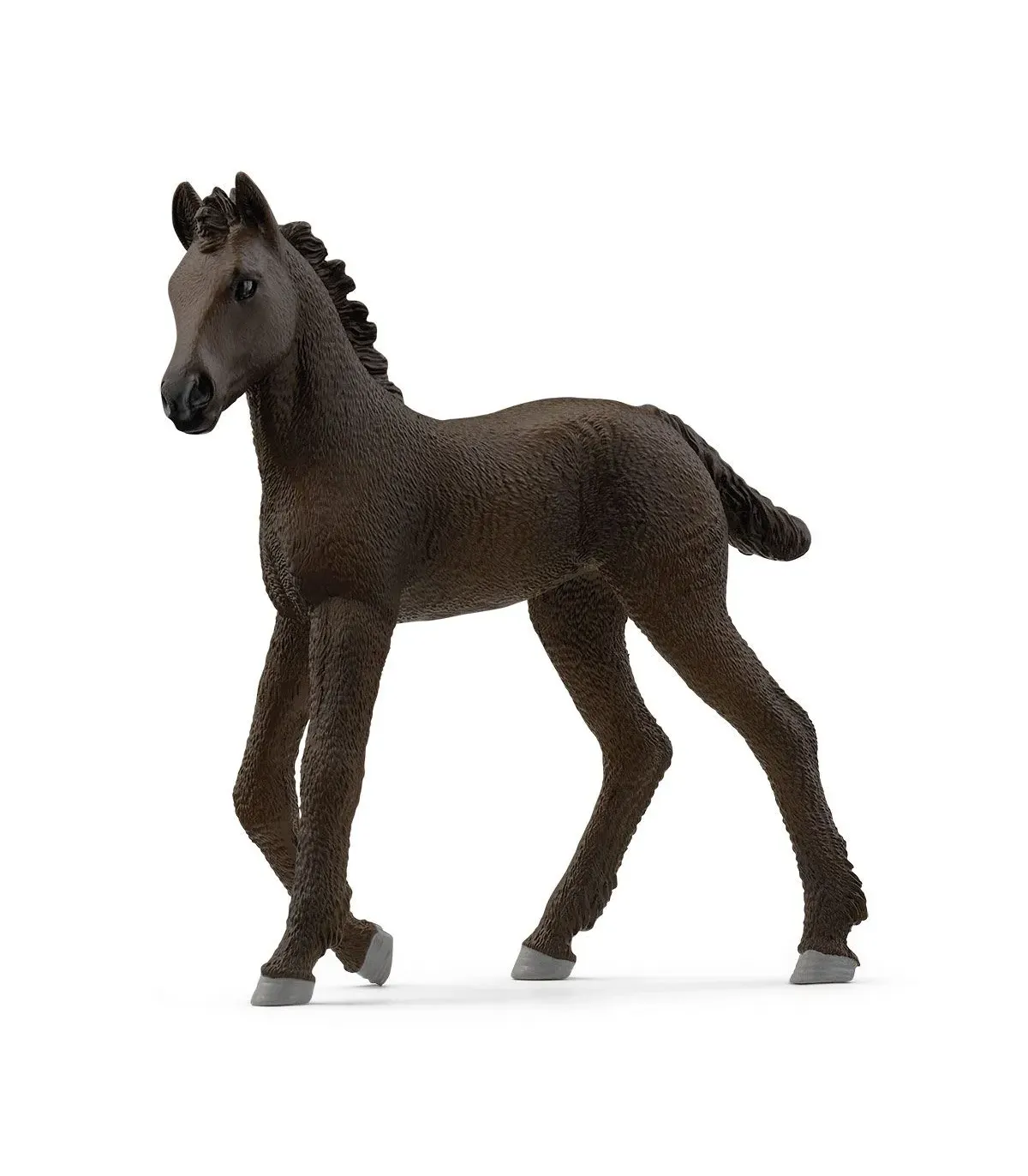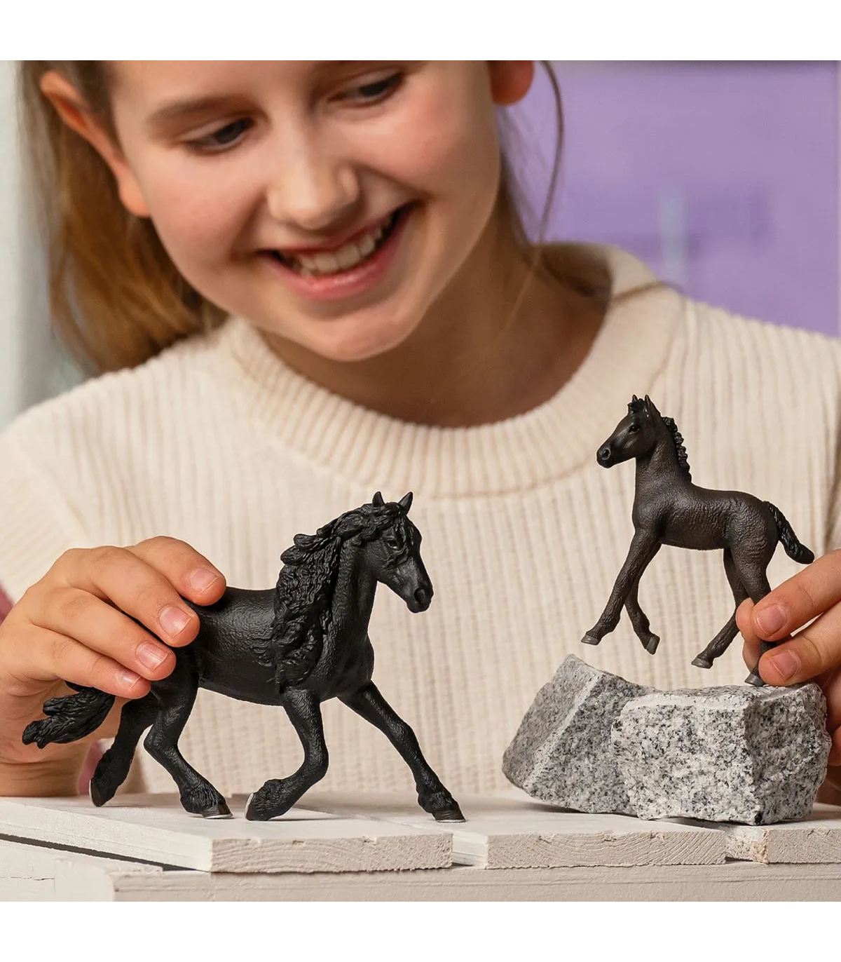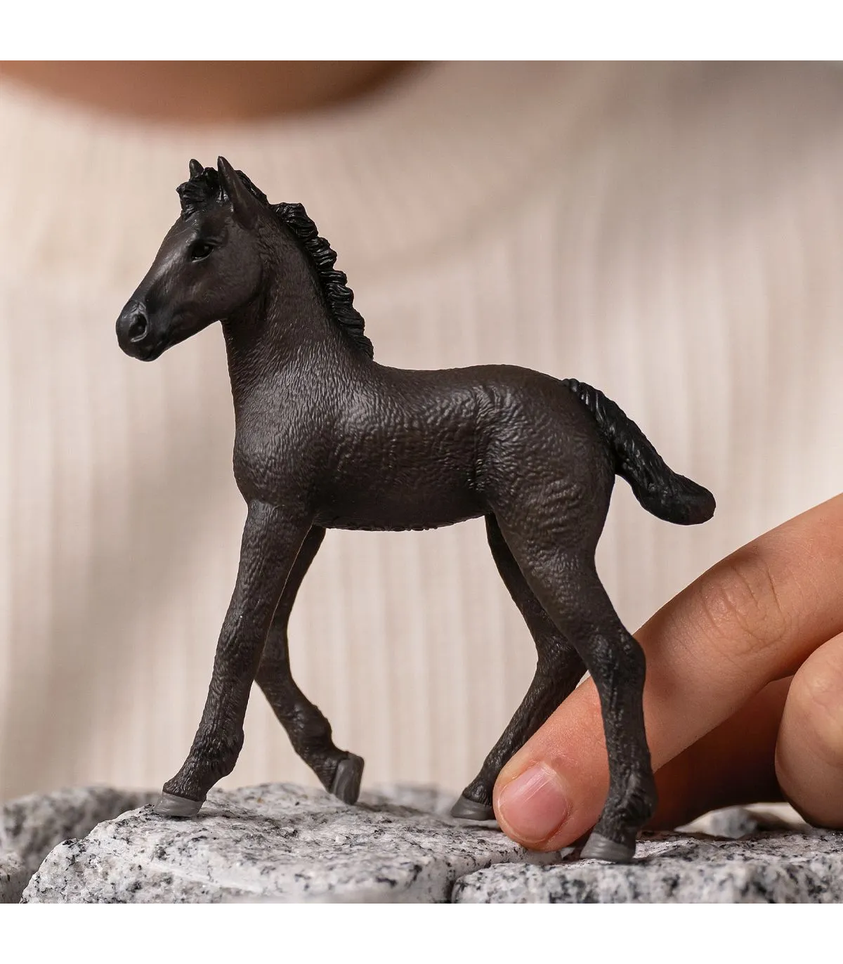 El simpático potro frisón levanta las orejas con curiosidad y estira el largo cuello. ¿Habrá descubierto algo interesante? Cruza la pradera trotando seguro sobre sus largas patas para verlo más de cerca. El potro frisón negro como el carbón se parece sin duda a su padre, el magnífico semental frisón (disponible por separado). Le espera un gran futuro como caballo de exhibición o de adiestramiento, las especialidades de esta antigua raza de caballos. Los frisones son fiables y amables.