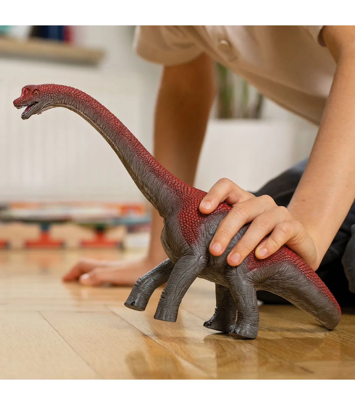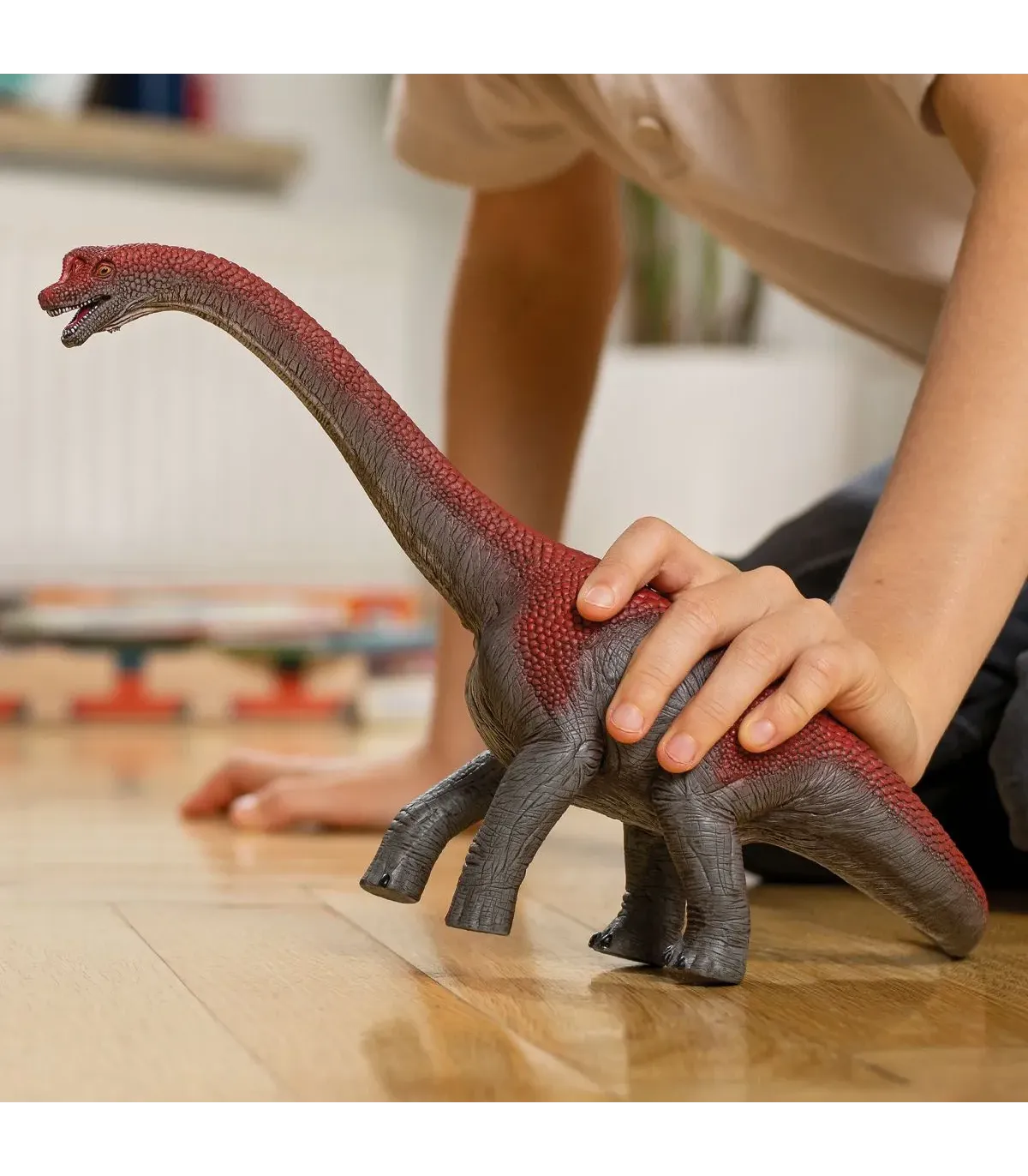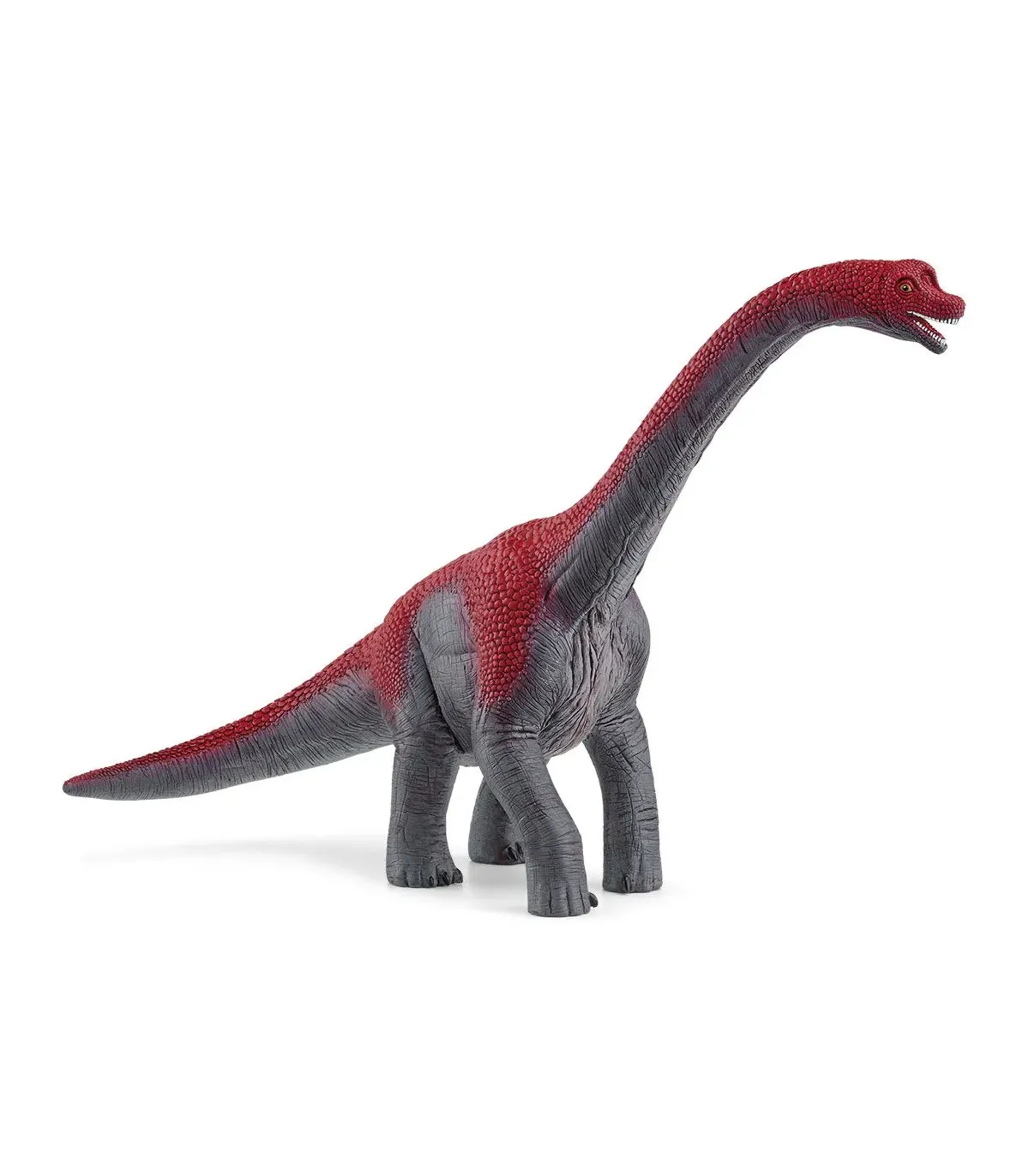 El enorme Braquiosaurio puede verse desde lejos: su largo cuello es tan alto como una casa y sobresale por encima de las copas de los árboles. ¿Qué estará haciendo ahí? Está arrancando hojas y ramitas de las ramas con sus afilados dientes. Casi nadie se atreve a molestarle mientras come, porque impresiona su tamaño, pero también la piel de color rojo que le cubre todo el cuerpo, desde la cabeza, pasando por el lomo, hasta la punta de la cola. Es una forma ingeniosa de mantener alejados a sus enemigos. No le gusta nada pelearse, como a ningún vegetariano.