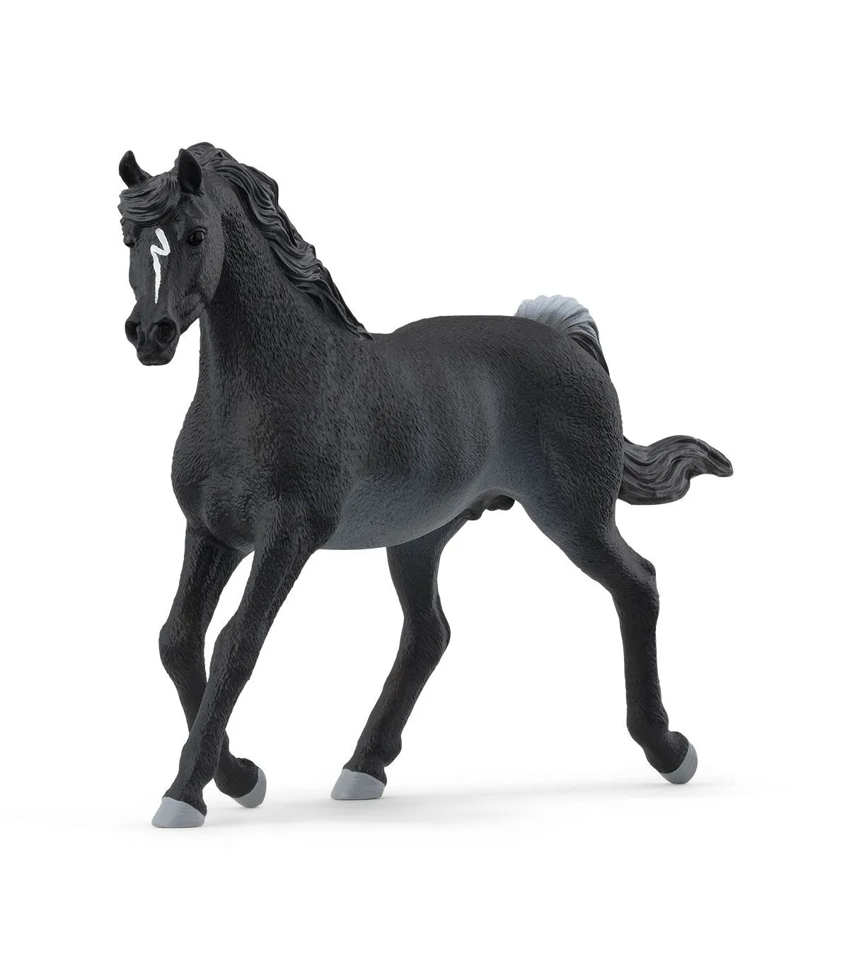 El semental árabe negro forma una pareja preciosa con la yegua árabe blanca como la nieve (disponible por separado). Pero también resulta deslumbrante cuando está solo. Sus largas y gráciles patas y su esbelto cuello le dan una gran elegancia. Y al mismo tiempo también es deportista, y por eso le encantan las carreras de caballos. Su carácter también es así: rebosa temperamento, pero también es sensible y delicado.