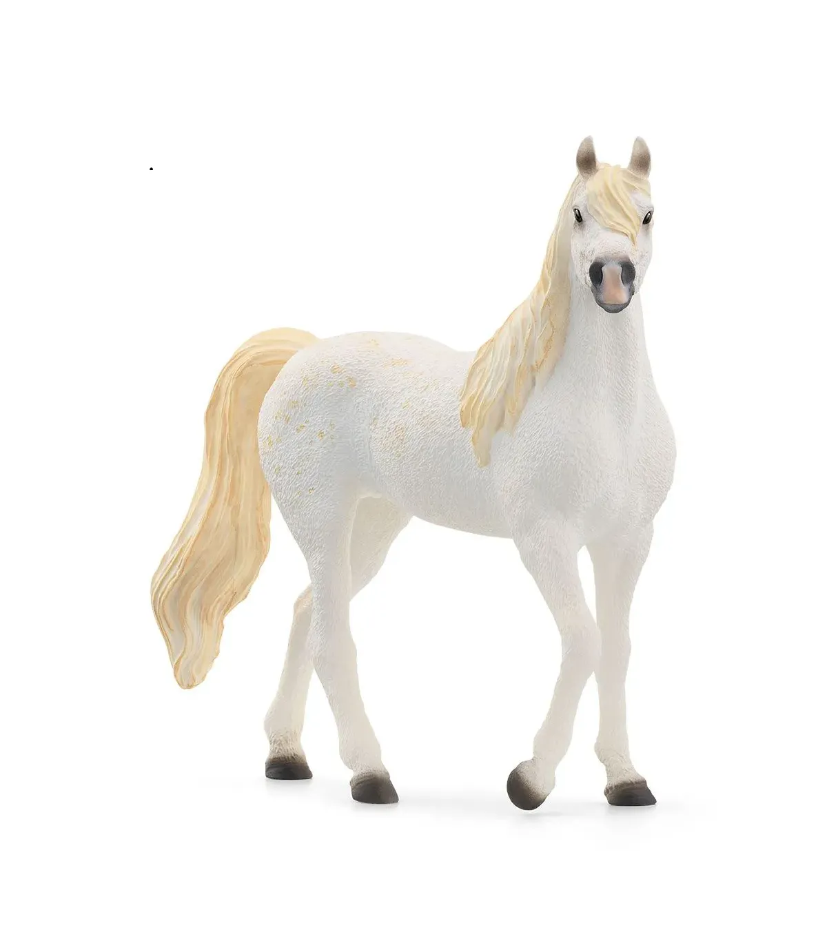 La bonita yegua árabe apoya grácilmente sus delicadas pezuñas y observa la pradera con mirada atenta. Un grueso mechón de pelo blanco amarillento le cae sobre la frente. ¡Es preciosa! ¿Sabrá lo preciosa que es? Solo las pezuñas y el hocico con los grandes ollares son oscuros. Una mancha rosa le adorna la parte delantera de la nariz. El resto del pelaje es blanco brillante. Endereza las orejas con atención. ¿Dónde estará su potro (disponible por separado)? Será mejor que vaya a echar un vistazo.