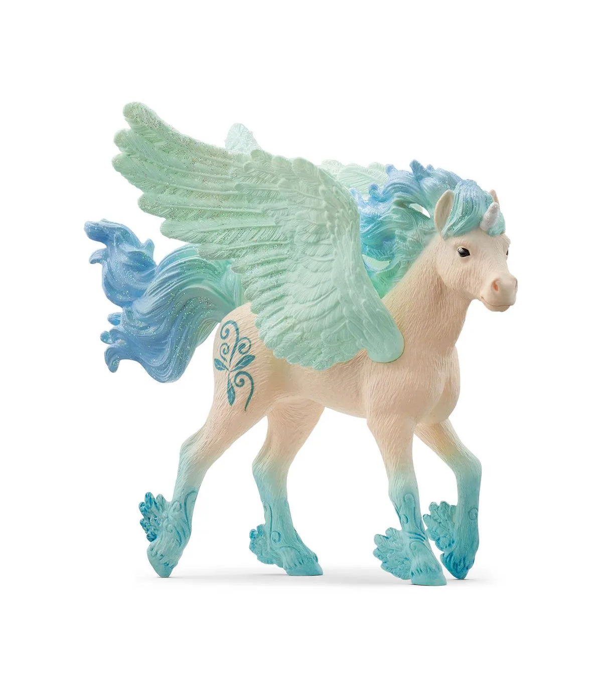 El potro unicornio Stormy despliega al viento sus grandes alas de color azul claro. ¡Este es el tiempo ideal para este potro tan temperamental! Se siente de maravilla cuando su crin de purpurina ondea con el viento en contra y la tormenta agita en todas direcciones su cola azul turquesa. A este pequeño torbellino le encantan las tormentas. Por eso no duda en hacer todo lo posible a favor de la energía eólica sostenible.