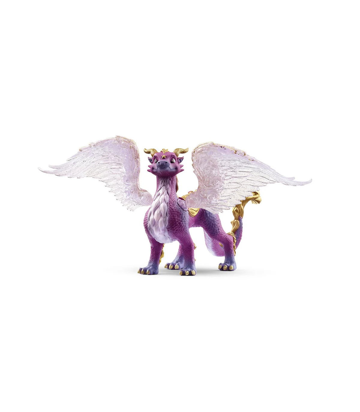 El Dragón de cielo nocturno tiene un aspecto impresionante con la estrella dorada de la frente, su armadura de escamas de color violeta oscuro y sus alas brillantes y transparentes. Su cola está adornada con rizos dorados que brillan como llamas. Pero si le miras a la cara, querrás hacerte amigo de él enseguida. Levanta su corto hocico en busca de aventuras. ¿Quién quiere trepar a su espalda magnética y montar en la silla dorada? Móntate: subiréis a lo más alto. ¡Menuda aventura!