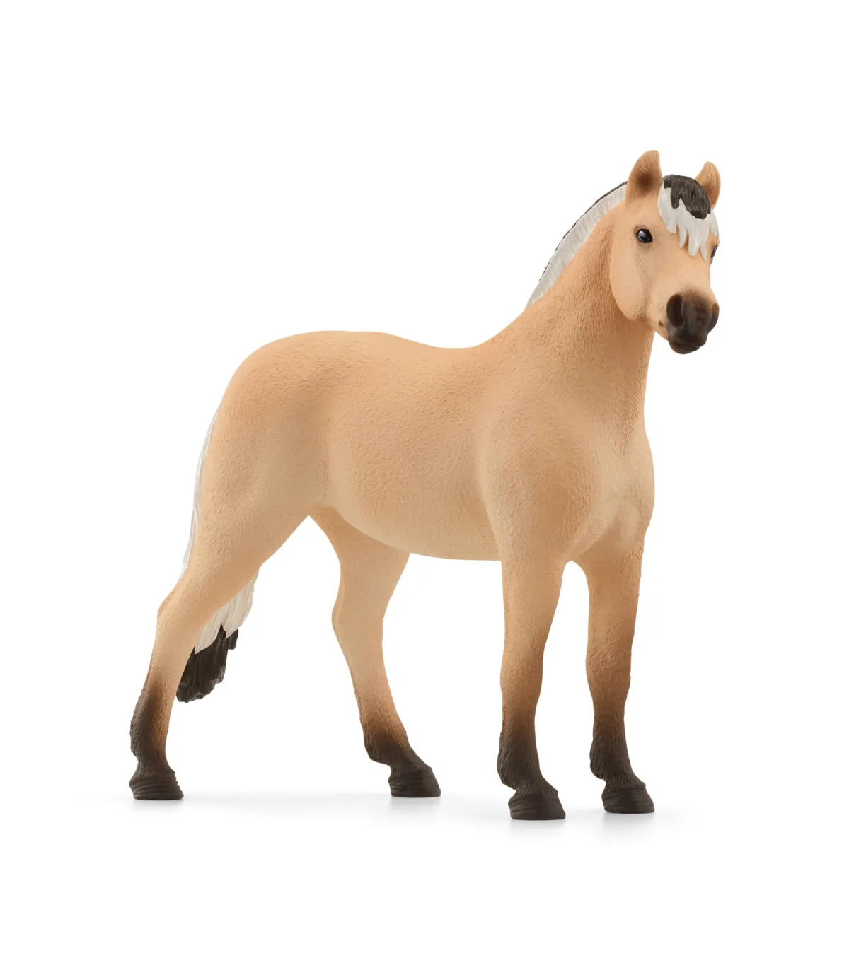 El robusto caballo fiordo examina su entorno con mirada atenta. Levanta sus pequeñas y puntiagudas orejas y escucha atentamente. Puede que tenga visita. Inclina la cabeza pensativo. No, no era eso, solo era el viento que hacía crujir las hojas. Qué pena, porque a este sociable caballo con la característica línea de anguila en el lomo y la crin de dos colores le encanta tener compañía. A lo mejor se acerca trotando a la yegua fiordo (disponible por separado).
