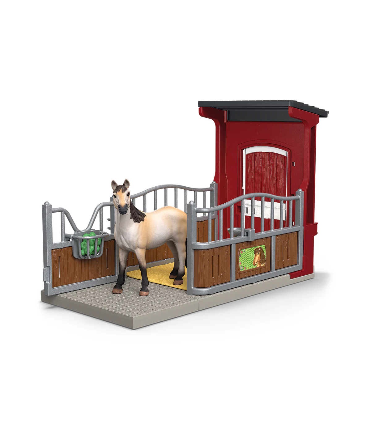 1 box para ponis, 1 yegua Mustang, 1 manzana verde, 1 pesebre