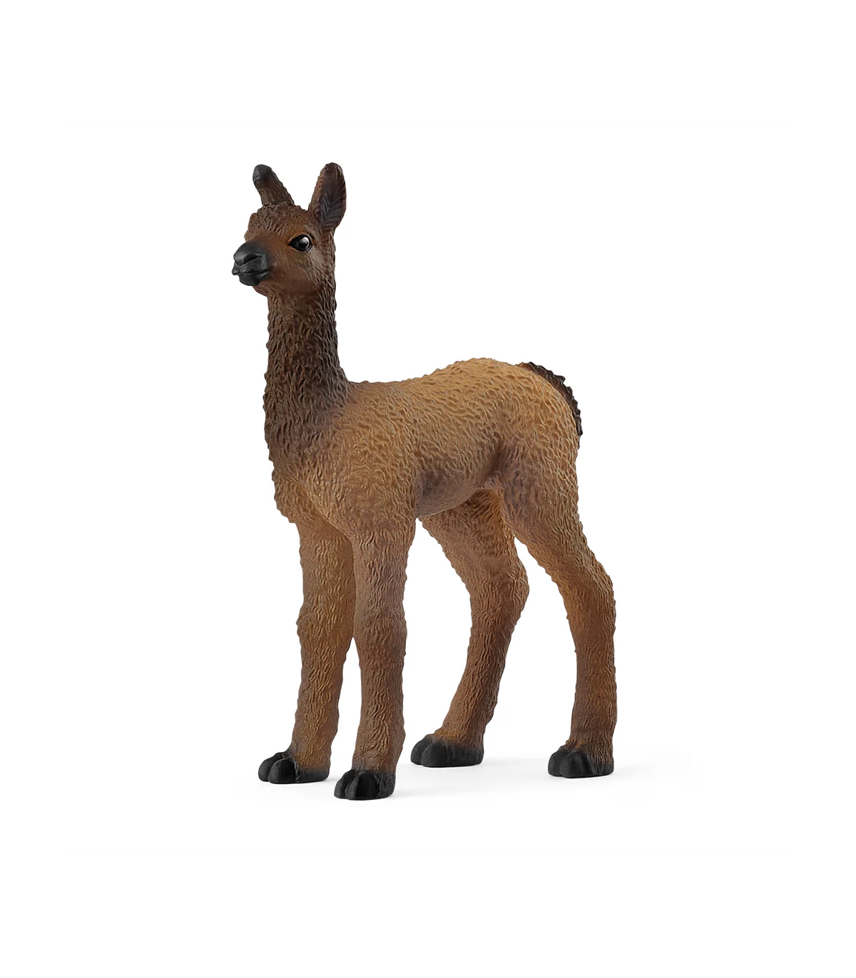 El pequeño potro de llama tiene un aspecto adorable con su abundante y esponjoso pelaje de color marrón. El cuello largo y la delicada cabeza son de color marrón oscuro, igual que las orejas puntiagudas. Solo la corta nariz y las patas son negras. Sus apacibles ojos brillan muchísimo. A lo mejor te deja que lo acaricies.