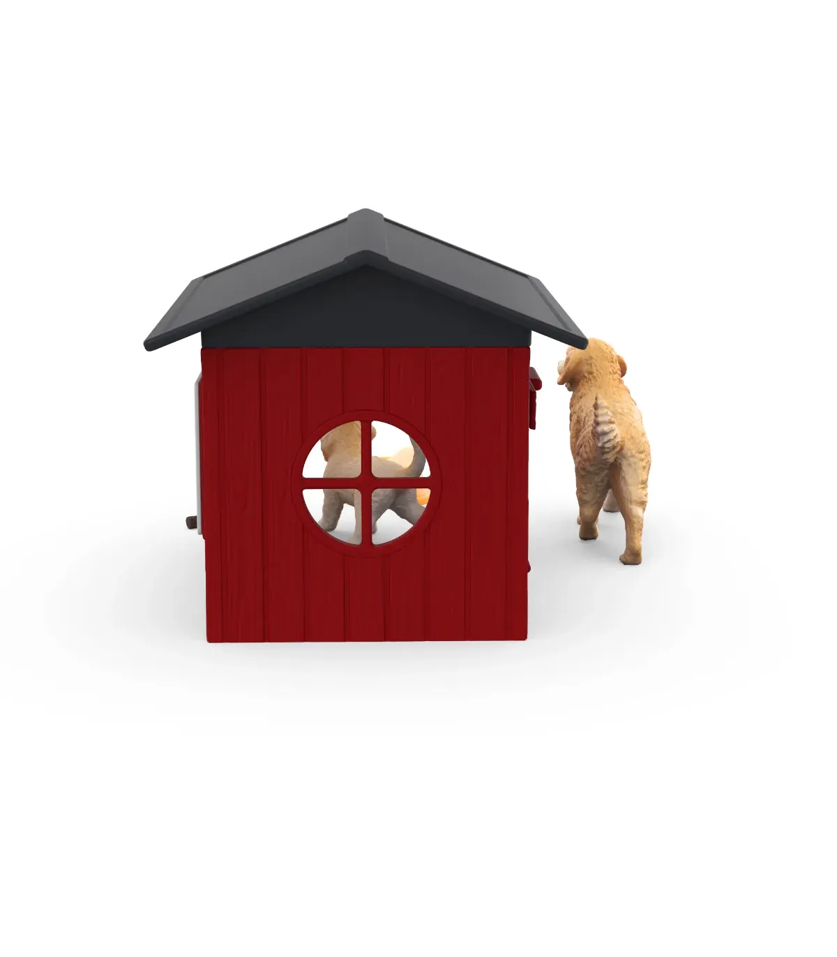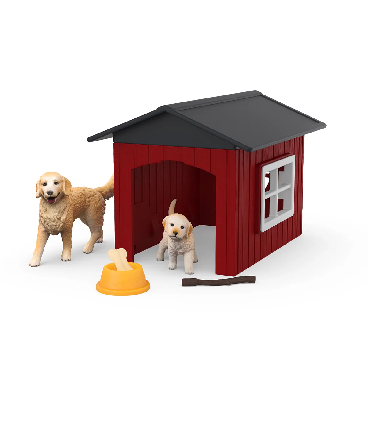 Quienes visitan la granja tienen que pasar por la caseta de los Golden Retriever. Aquí viven la perra Golden Retriever y su cachorro. ¡Qué acogedora! La caseta es de madera roja y el tejado es de color antracita. Por las ventanas laterales entra mucha luz. Cuando no están vigilando, los dos perros tienen tiempo para roer su hueso. ¡Genial!